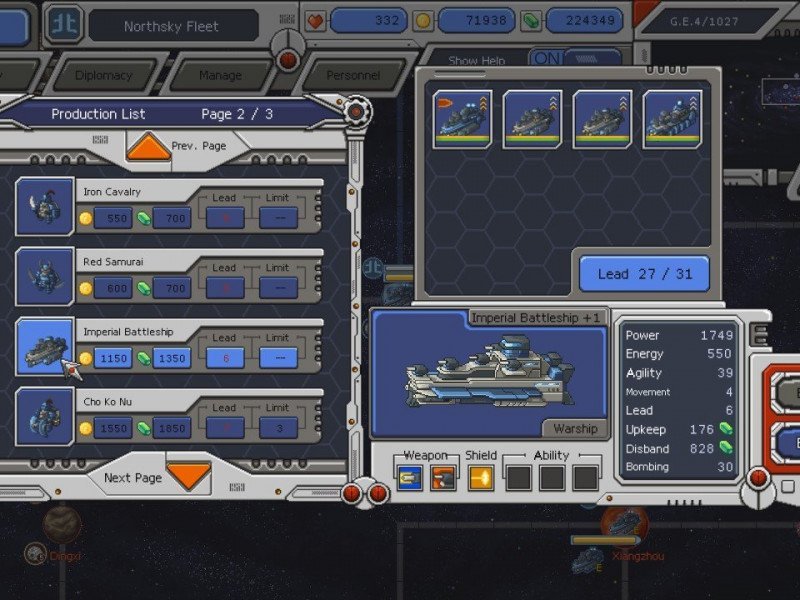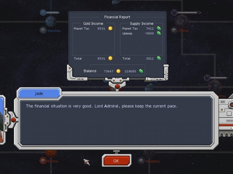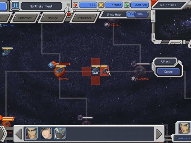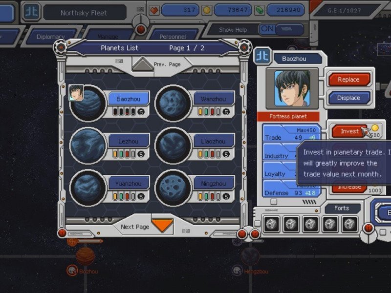 Cette phase comporte une forte composante de gestion, où les planètes individuelles doivent être gérées. Celles-ci disposent de différentes ressources à prendre en compte : deux formes de monnaie, la loyauté et la défense. Les deux premières sont nécessaires pour acheter des unités et renforcer les planètes elles-mêmes, la loyauté décrétant le taux de production de ressources, tandis que la défense détermine le nombre de tours d'attaque nécessaires à l'ennemi pour conquérir la planète. Toutes ces statistiques peuvent être améliorées en investissant des ressources, mais elles augmenteront également de manière indépendante au fur et à mesure que le jeu progresse. Il est alors possible d'assigner un gouverneur à une planète qui, à son tour, augmentera l'efficacité de la production de ressources. Cette phase du jeu est ensuite constituée de choix typiques du genre : il est possible de former des alliances avec les factions voisines, avec le système classique d'échange de ressources, de déclarations de guerre, etc. De même, il est possible, par exemple, de conquérir des planètes ennemies en plaçant un de nos vaisseaux au-dessus d'une cible, puis en attaquant et en effondrant les défenses en un certain nombre de tours. Ce sont précisément ces relations qui constituent l'aspect le plus problématique du titre, car elles sont souvent confuses (les ennemis attaquant sans raison apparente) dans l'exécution des différentes dynamiques et, pire encore, elles sont alourdies par une interface qui ajoute à la confusion générale en raison de sa complexité inutile.