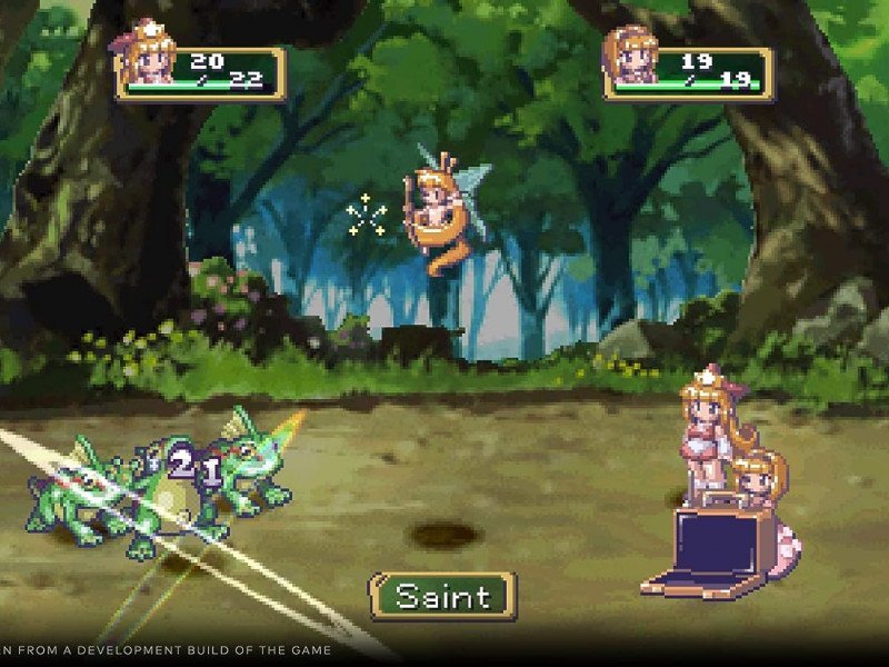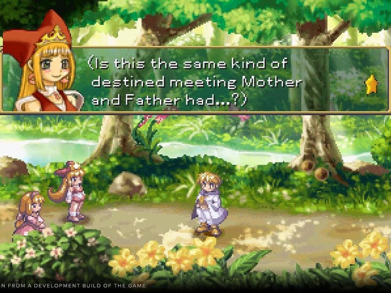 Si vous lisez cet article, il faut supposer que vous avez déjà joué à Rhapsody : A Musical Adventure ; après tout, ce dont nous allons parler ici est une suite, mais pas l'histoire elle-même. Cependant, nous n'entrerons pas dans les détails de l'aspect narratif pour des raisons évidentes, mais nous parlerons de l'essentiel pour vous donner un peu de contexte. Rhapsody II : Ballad of the Little Princess se déroule 12 ans après la conclusion de son prédécesseur, dans lequel Cornet et le prince Ferdinand se marient et ont une fille. Dans cette histoire, nous suivons Kurusale Cherie "Kururu" Marl Q., la fille de Cornet et Ferdinand, une jeune fille joyeuse et honnête, naïve en raison de son éducation stricte qui lui interdit de quitter le château. Kururu a un sens de la mode très discutable, mais ce n'est qu'une remarque inutile. De plus, comme tout enfant arty qui se respecte, Kururu n'aime pas étudier et ne prend pas non plus ses supérieurs au sérieux, les cours qu'elle reçoit tombant dans une oreille et ressortant par l'autre. Toutes ces crises de colère sont dues au fait qu'elle veut se libérer des contraintes de la royauté et poursuivre son rêve : trouver le prince tant désiré, comme l'a fait sa mère. En l'absence de ses parents, Kururu tente de s'échapper du château où, avec Crea, sa complice (enfin sa meilleure amie), elle part à l'aventure dans les terres de Marl. Ces aventures mènent même à une rencontre avec Cello, un jeune homme mystérieux qui sauve la jeune fille d'un dragon, ce qui rappelle la scène de l'Aventure musicale où Cornet et Ferdinand se rencontrent pour la première fois - bien qu'ici, cela ressemble plus à un combat de chats et de chiens qu'à un coup de foudre. L'histoire, cependant, prend forme au fur et à mesure que la mésentente entre Kururu et Cello se transforme en un rapprochement plus amical, dans lequel la protagoniste nourrit progressivement des sentiments affectueux pour le jeune homme, ce qui lui donne la détermination d'affronter de grands dangers au nom du garçon - encore une fois, à l'image de sa mère. En même temps, ses nombreuses mésaventures finissent par servir de tremplin à sa maturation et à sa découverte de soi. Ballad of the Little Princess se concentre en fait sur ce point, donnant un noyau très intéressant à la narration qui, bien que très sucrée et sans grandes couches, fonctionne de manière satisfaisante avec la distribution centrale des personnages, encore mieux que dans Musical Adventure.