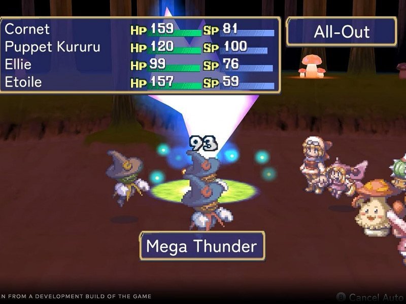En gros, les chapitres 2 et 5 sont ceux qui comblent vraiment les trous dans la narration des jeux, mais ce n'est pas comme si les autres étaient dispensables. Ce n'est pas du tout le cas ! Le seul problème, c'est que comme il s'agit d'histoires isolées, on s'attend à ce que le joueur ait la liberté de les choisir par pure commodité. Mais non : il faut les jouer une à une pour débloquer les chapitres suivants. En fait, cela n'est pas dérangeant. Ce sont des histoires très divertissantes, même si elles durent plus longtemps qu'elles ne le devraient. Dans l'ensemble, la diversité des thèmes brise le cycle de la monotonie et rend la transition entre les chapitres plus douce. Au final, il s'agit plus d'une compilation de fanservice à digérer petit à petit qu'une obligation. Ah oui, les systèmes de Memories of Marl Kingdom : Le combat est toujours au tour par tour, comme dans Ballad of the Little Princess, mais sans plus. Cependant, la façon dont il se comporte est très différente, ajoutant étonnamment plus de couches au système. Le changement le plus brutal se situe au niveau de l'organisation du groupe : vous pouvez désormais mettre jusqu'à 12 personnages à l'écran ! En ce qui concerne le combat proprement dit, les choses ne sont pas si différentes des autres jeux : le personnage en première ligne peut effectuer l'action, tandis que ceux qui sont à l'arrière portent des coups normaux, ou bien vous pouvez passer le tour d'action du personnage en première ligne pour choisir les actions de ceux qui sont à l'arrière. C'est simple, non ? De plus, toutes les bases de combat des jeux précédents sont présentes, comme les actions spéciales qui consomment des HP et les compétences secrètes que les marionnettistes peuvent utiliser. A noter que, comme dans Musical Adventure, les monstres et marionnettes qui rejoignent le groupe peuvent désormais être en première ligne, contrairement à Ballad of the Little Princess où ils ne servaient que de soutien. I