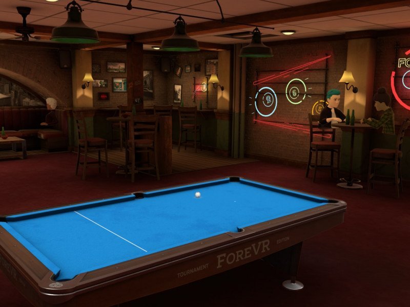 Vous entraînant dans des bars qui ne manquent pas de style, ForeVR Pool est donc un jeu de billard entièrement jouable en VR. Développé par ForeVR Games, le titre fait preuve d'un assez grand réalisme dans son gameplay. Nous découvrons une immense salle de jeux, nécessitant moins de deux mètres carrés, qu'il est possible d'explorer librement. Nous avons plusieurs défis dans le jeu et vous pouvez jouer en ligne et hors ligne. De quoi donc séduire les fans à priori, même si la réalisation technique se montre parfois assez austère, malgré des graphismes plutôt agréables et d'un grand réalisme. Les personnages du jeu sont quant à eux modélisés très simplement, comme en témoigne les images ci-dessous. Mais bon, ce n'est pas un problème en soi, car il est fréquent dans les jeux de billiard qu'aucun personnage ne soit présent autour de la table et que la queue de billard flotte comme par magie. La jouabilité se montre globalement satisfaisante, avec une physique des billes plutôt correcte, et une sensibilité des mouvements assez crédible. Nous sommes surpris de la véracité des mouvements des contrôleurs Sense. Une fois à la table, nous pouvons nous déplacer d'un côté à l'autre, et lorsque c'est à notre tour de jouer, nous pouvons appuyer sur les gâchettes pour viser et effectuer le coup. En revanche, le jeu n’utilise actuellement aucun retour haptique dans les contrôleurs. Il y a des options pour activer une locomotion fluide et des virages fluides, y compris un curseur pour la vitesse de rotation, mais cela se fait au prix de la perte des commandes de téléportation très bien mises en œuvre qui vous permettent d'accéder très rapidement de l'autre côté de la table de billard.