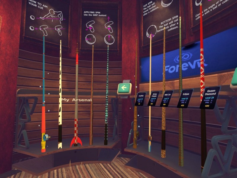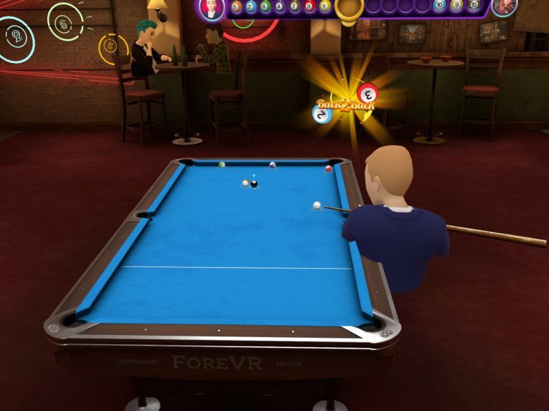 Dans sa catégorie, ForeVR Pool fait plutôt mouche donc, et si l'ambiance sonore demeure bien silencieuse. Le jeu fonctionne comme des phases, à chaque adversaire que nous battons, plus le suivant est fort. Et l'intelligence artificielle du premier adversaire était déjà très bonne. Le titre comporte deux variations de ce sport, 8-Ball et 9-Ball. Dans le détail, le 8-Ball vous demande d'empocher tous ses boules avant de finir avec la noire (qui représente le numéro 8), tandis que le 9-Ball requiert de remporter le boules dans l'ordre croissant, sachant que celui qui remporte la dernière (numéro 9) gagne la partie. La progression dans le jeu est liée à la montée de niveau (via l'XP en jouant) qui débloque de nouvelles queues de billard, qui doivent être achetées en utilisant la monnaie également gagnée en jouant. Pendant que vous jouez, vous pouvez également mettre la monnaie que vous avez en jeu afin que le gagnant garde le pot. Le jeu fournit par défaut des visualisations (lignes cibles) qui vous aident à viser vos tirs, mais il est possible de les désactiver pour un défi plus élevé une fois que vous avez une meilleure idée du jeu. Il existe également la possibilité d'activer le chronomètre des tirs afin que les joueurs ne mettent pas trop de temps à faire leur tour.