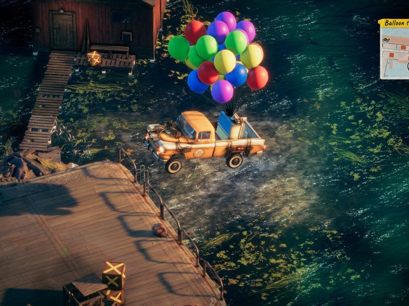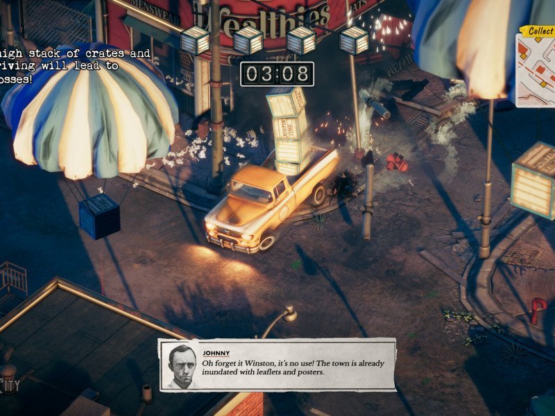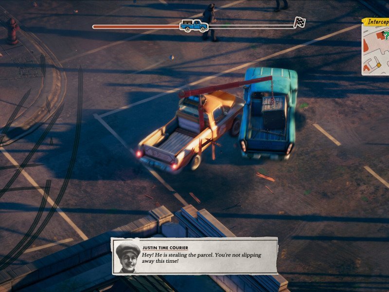 Le gameplay est au cœur de Deliver At All Costs : un mélange de conduite isométrique, de destruction artérielle et de missions en constante évolution. Winchester , au volant du camion We Deliver, se transforme en une force incontrôlable : destruction urbaine garantie avec tout ce qui bouge. Les livraisons sont caractérisées par une physique démesurée : chute de caisses de melons, ballons géants soulevant le camion, démolitions créatives. C’est cette variété qui offre les meilleurs moments, surtout au début. Le problème, c’est qu’avec le temps, la formule devient trop répétitive : détruire, livrer, recommencer. Malgré les missions « différentes », le manque de développement systémique (récompenses, évolutions, objectifs approfondis) fait de chaque chose une fin en soi. L'un des meilleurs moments est une course effrénée pour voler le colis d'un autre fourgon, avec des combats et des démolitions dignes de Crazy Taxi 2. Ces missions sont particulièrement réussies lorsque l'adrénaline, le temps et la compétition se combinent harmonieusement. Malheureusement, à côté de ces pics, on trouve des missions lentes ou ennuyeuses : équilibrer des ballons, tenir des melons ou effectuer des livraisons minimalistes au pas. Ces pauses atténuent la frénésie initiale d'un gameplay par étapes. La progression souffre du manque d'incitations : détruire des bâtiments ne rapporte pas de points, il n'y a ni classement ni récompense. Même les gadgets du fourgon, bien qu'amusants, ne sont jamais essentiels. L'ensemble donne l'impression d'une boucle sans véritable objectif. Techniquement, le camion est quasiment invincible : il se redresse tout seul, se répare avec un bouton et reprend vie après un retournement. C'est amusant, jusqu'à ce que cela devienne moins exigeant. Point positif : système de police et de poursuites : bruits de sirène, cachettes improvisées dans des poubelles ; Mais tout cela est mécanique et prévisible, sans jamais dépasser Ken et Barbie, avec des concessions de conception intéressantes mais peu mémorables.