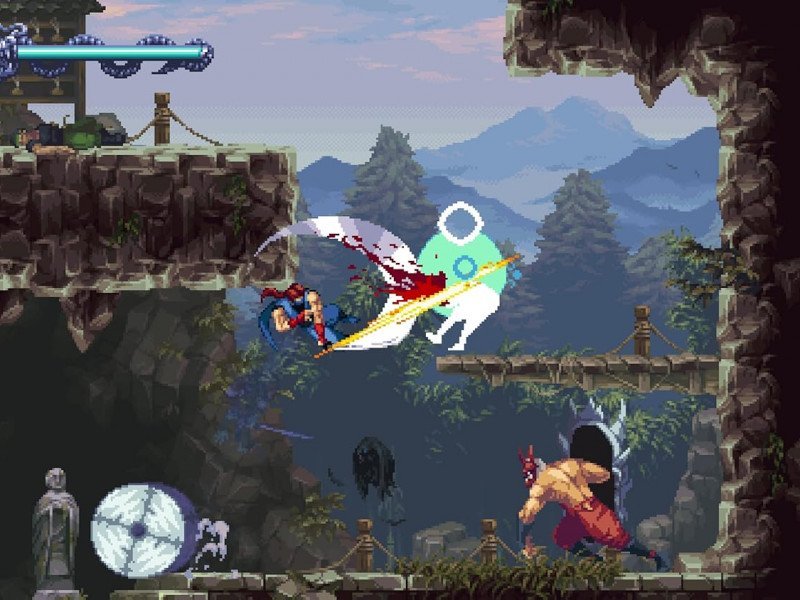Le jeu propose deux personnages jouables : Kenji Mozu et Kumori . Kenji se concentre davantage sur les attaques au corps à corps, tandis que Kumori excelle dans les attaques à distance. Cependant, leurs mécaniques de jeu sont fondamentalement similaires, ce qui rend le jeu de plateforme plus ou moins similaire. Kumori ne sera pas immédiatement accessible au début du jeu. Elle rejoint Kenji en cours de partie. Ce jeu propose plusieurs mécaniques uniques que nous jugeons essentielles, notamment le Boost Guillotine et l'Hypercharge . Le Boost Guillotine est une technique similaire au Double Saut, où votre personnage peut rebondir en appuyant sur le bouton de saut en plein vol lorsqu'il rencontre un ennemi ou un projectile. Outre l'allongement des sauts, cette mécanique permet également d'allonger les combos d'attaque. Cette technique est cruciale dans les parties de plateforme. Nous avons également rencontré une mécanique similaire dans B?: Path of the Teal Lotus, avec une fonction plus ou moins identique. La deuxième fonctionnalité est l'Hypercharge , une technique qui renforce votre prochaine attaque pendant une durée limitée. Vous pouvez obtenir l'Hypercharge en éliminant un ennemi luisant ou en la déclenchant manuellement. Cependant, la déclencher manuellement en maintenant le bouton d'attaque enfoncé nécessite de sacrifier une petite partie de votre barre de santé. Son utilisation doit donc être réfléchie et ne doit pas être effectuée au hasard, car elle a un coût.