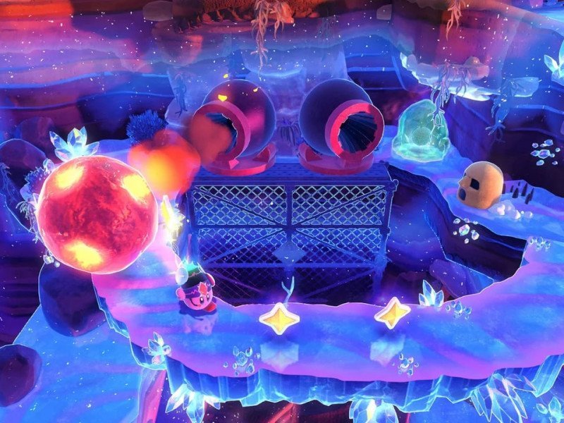 Comme nous l'avons vu avec la version de Super Mario 3D World, sortie sur Switch avec le nouveau chapitre « Fureur de Bowser » , Kirby et le monde oublié propose un nouveau chapitre. Une mystérieuse météorite s'est écrasée, prête à libérer ses sombres pouvoirs. La solution consiste à rassembler suffisamment d'Étoiles (les Waddle Dees de la météorite) pour restaurer l'étoile et sauver le monde d'une destruction certaine. Les joueurs qui commencent une nouvelle partie pourront accéder aux niveaux du nouveau chapitre après avoir terminé le premier monde, tandis que ceux qui tentent de s'en sortir en poursuivant leur sauvegarde initiale auront accès à tous les niveaux d'un coup, sans aucune autre action requise. À première vue, les choses ne semblent pas très différentes du jeu principal. La logique de réussite des niveaux dans "Le pays des étoiles filantes" est identique à celle du jeu original. En effet, les joueurs doivent à nouveau atteindre la ligne d'arrivée et débloquer les Starries qui les attendent, tandis que l'accomplissement de missions spécifiques leur permettra d'en gagner davantage. Certains joueurs, même les plus exigeants, pourraient dire qu'il est inutile de s'attarder sur ce chapitre, car l'action semble se dérouler dans les niveaux existants. Et c'est vrai. Cette extension ne se déroule nulle part ailleurs. Ses douze niveaux sont répartis sur les six mondes du titre, ce qui rend la progression du chapitre encore plus rapide pour les joueurs existants. Et c'est vrai. Cependant, la qualité de chaque niveau change considérablement. À l'exception des stages du premier monde, où l'on ressentait un sentiment de déjà-vu des originaux, les levels restants offrent une expérience de jeu plus chaleureuse et plus agréable. Le design déjà astucieux, avec ses éléments cachés et ses nombreux objets à collectionner qui attendent d'être révélés, est encore amélioré par l'ajout des cristaux. Les cristaux, dispersés dans l'espace, peuvent révéler de nouveaux chemins et de nouveaux éléments à explorer, tout en transformant l'environnement et en donnant l'impression que quelque chose de nouveau est réellement là. Des ponts surgissent de nulle part, les obstacles disparaissent… et, en résumé, un nouveau monde s'ouvre aux joueurs, avec de nouveaux adversaires et de nouvelles transformations spatiales pour Kirby, offrant un véritable renouveau à la formule existante.