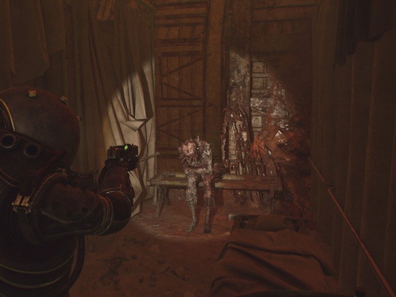 Sur le plan technique, Cronos: The New Dawn confirme une fois de plus la croissance de Bloober Team, offrant un package visuel solide et étonnamment robuste. Le double mode graphique – Qualité et Performance – est désormais un incontournable de la génération actuelle de consoles ; ce dernier, à notre avis, est préférable, car il garantit une fluidité et une réactivité supérieures sans sacrifier trop de détails. La palette de couleurs s'inspire de la saleté et de la corrosion : sable, rouille et teintes chaudes dominent les extérieurs, tandis que les intérieurs sont étouffés par une biomasse organique inquiétante, un organisme extraterrestre rappelant étrangement la chair humaine, qui a désormais colonisé chaque recoin de l'environnement. Il en résulte un impact visuel qui génère une oppression constante et une sensation palpable d'étouffement. L'utilisation de détails et d'effets volumétriques amplifie cette sensation : dans certaines séquences extérieures, Bloober accentue délibérément l'effet de brouillard, réduisant la visibilité au point de déstabiliser le joueur. Un choix intelligent d'un point de vue technique, utile pour masquer certains compromis graphiques, mais en même temps parfait pour accroître l'aliénation et le sentiment de vulnérabilité. L'expérience est complétée par une bande-son que l'on peut aisément qualifier de majestueuse. Maîtrisée et jamais envahissante, elle accompagne les moments les plus tendus de notes tendues et tranchantes, tout en laissant la place à une conception sonore éclatante. Craquements métalliques, portes qui se referment, sifflements soudains dans les tuyaux : avec un casque surround ou, mieux encore, une configuration Atmos, l'immersion est totale. On entend non seulement la direction des pas d'un ennemi ou anticipe son arrivée grâce à un souffle étranglé provenant de l'obscurité, mais on distingue presque la densité de la biomasse pulsant derrière les cloisons. Un travail de qualité, complété par un doublage anglais globalement positif et bien interprété, qui scelle une composante technique parmi les meilleures jamais créées par l'équipe polonaise.