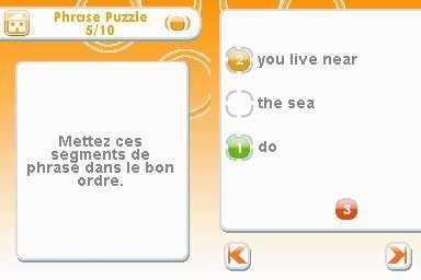 Après Practise English de Nintendo, voici donc un jeu très inspiré nommé Berlitz : Enrichissez votre vocabulaire Anglais. Le titre reprend en effet pas mal des options du jeu original, avec toutefois davantage d'exercices disponibles dès le début. Néanmoins, le menu général reste assez austère et loin du côté chaleureux de Practise English. Au programme donc, des exerces individuels, des tests de vocabulaire, de la grammaire, mais aussi des mots à correctement orthographier, ou bien à traduire dans la langue de Shakespeare.