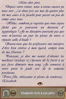 La Nintendo DS profitant d'un écran tactile, les jeux d'aventure venus du PC sont de plus en plus nombreux sur la console portable. Partant de ce constat, Frogwares a décidé d'adapter Sherlock Holmes sur la console de Nintendo. Premier bémol, le choix du volet n'apparaît pas très pertinent, puisque le Mystère de la Momie est sans doute l'un des moins bons épisode de la série. Le scénario y demeure assez basique : La cousine de Mister Holmes, Elisabeth Montcalfe, lui a demandé de retrouver son père. Le détective quitte donc Londres pour se retrouver dans un manoir assez glauque, et riche en secrets. Quant à son fidèle assistant Watson, il sera parti en vacances. On passera donc la plupart de son temps seul, à errer d'une pièce à l'autre, jusqu'au prochain chapitre. La progression est d'ailleurs assez scripté, et si vous ne réalisez pas certains mouvements dans un ordre précis, cela ne fonctionnera pas. Mais si vous êtes vraiment perdu, le jeu comporte une aide intégrée, proposant différents indices jusqu'à la résolution totale de l'énigme. Une aide qui sera finalement très utile tant la jouabilité est poussive, en particulier les déplacements de Sherlock. Nous sommes loin du confort d'un Hotel Dusk (Nintendo) à ce niveau là, même si l'inventaire est heureusement accessible par une pression sur les deux boutons latéraux de la console. La durée de vie en prend forcément un coup, mais elle demeure assez élevée puisque de nombreuses énigmes sont proposées.
