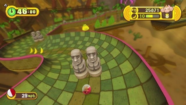 Si vous n'avez jamais joué à Super Monkey Ball, quelques explications s'imposent, car le concept n'a pas varié d'un iota : Vous contrôlez donc un petit singe qui est enfermé dans une bulle, et qui doit compléter des niveaux aux reliefs tortueux tout en ramassant le maximum de bananes. Certains environnements sont pour le moins vicieux mais il va falloir maîtriser le nunchuk et la Wiimote, pour avancer. Mais la grande nouveauté de cette version vient de la possibilité de jouer avec la Wii Balance Board de Wii Fit. Il suffit de se pencher dans la direction voulue, pour le décor bouge et que la boule avance. Ce;a demandera de la patience sous peine de chuter à plusieurs reprises. Pas de panique cependant, les premiers niveaux font office de tutoriel et vous expliquent les commandes principales du jeu.