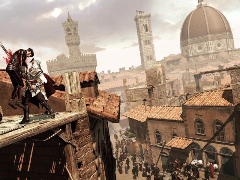 Exit la Terre Sainte et les années 1100. Assassin's Creed 2 prend place cette fois au coeur de la Renaissance Italienne. Nous y incarnons un autre ancêtre de Desmond Miles, Ezio Auditore, un jeune homme assez assez étonnant. En effet, lorsque la partie débute, Ezio n'est absolument pas un assassin de talent, mais plutôt un coureur de jupons. Sous l'effet d'une terrifiante conspiration, et animé par a soif de vengeance), Ezio va se transformer en tueur, dont on pourra découvrir tous les mouvements grâce à un long tutoriel scénarisé, posant les bases de l'aventure. Afin de mettre un terme aux hostilités, le personnage s'attaquera à l'ennemi et comme le Prince de Perse en son temps, il devra éviter les mécanismes piégeux qui traînent dans les niveaux, se montrer discret pour éviter les gardes, et également résoudre quelques énigmes pour débloquer la route. Il faut donc utiliser son environnement pour progresser dans l'aventure et en priorité trouver le lieu d'observation de votre prochaine mission.