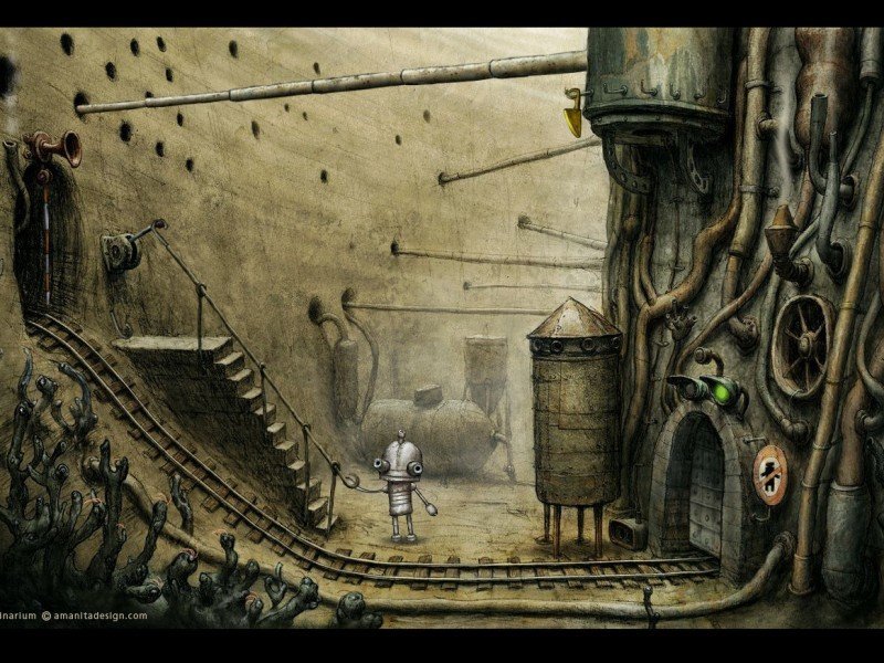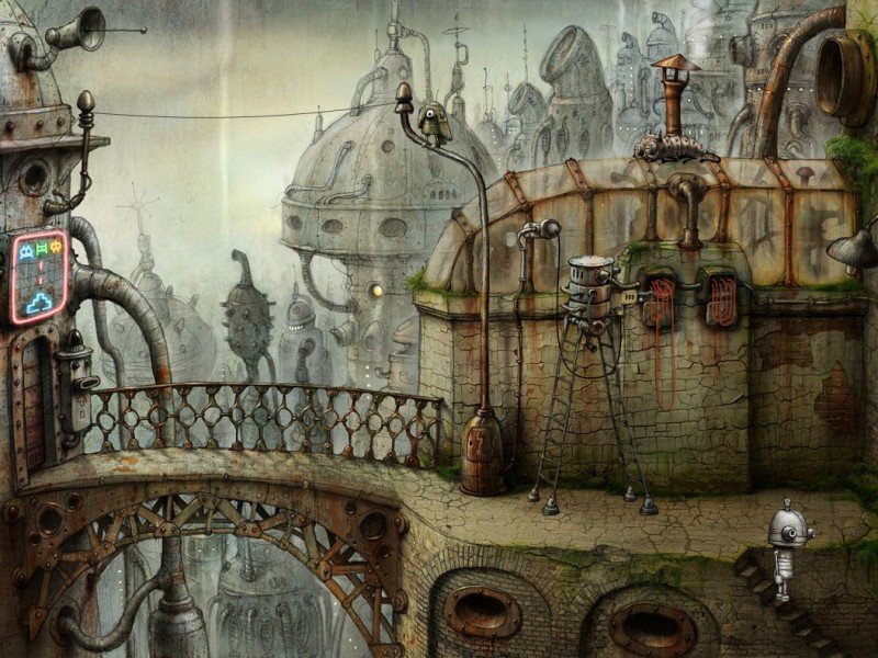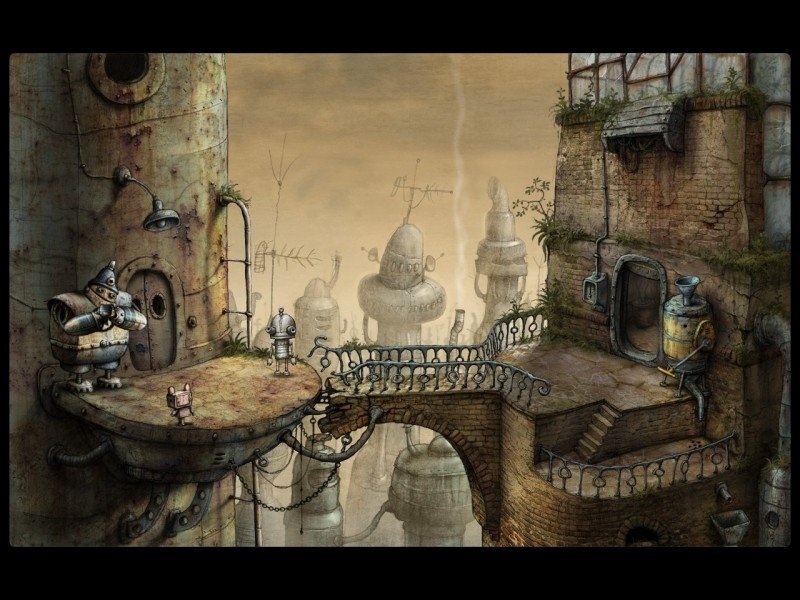 Machinarium est une ville étonnante. Vous aurez le plaisir de la parcourir avec un petit robot récemment jeté au dépotoir, et qui n'est pas au top de sa forme. Pour restaurer son statut, il devra retrouver dans la cité les pièces manquantes s'il veut retrouver sa bien-aimée, tout en préparant sa vengeance contre ceux qui l'ont mis dans cet état. Le robot présente un aspect pour le moins sympathique, et prendra le temps d'aider tous ses concitoyens. Car il n'est pas le seul à avoir récemment eut des déconvenues. Heureusement, vous pouvez agir avec de nombreux éléments en étirant ou en rétractant le corps du robot comme un télescope. Il faudra fréquemment effectuer des combinaisons d'objets pour franchir les obstacles, et la difficulté des casse-têtes augmente d'ailleurs assez rapidement mais le titre fait preuve d'une certaine logique cartésienne. En outre, ce n'est pas forcément les puzzles les plus encombrants qui s'avèrent les plus difficiles. On pourra cependant compter sur le livre de solutions qu'a récupéré le robot, pour se sortir de situations délicates (après avoir réussi un petit jeu d'arcade).
