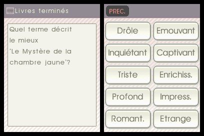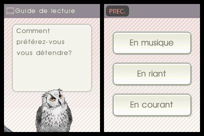 Pas de surprise du côté de la prise en main, on tiendra la console verticalement, à l'instar du Programme d'Entraînement Cérébral du Dr Kawashima. Les deux écrans affichent alors les deux pages d'un livre ouvert, et pour tourner une page (bruitage à l'appui), il suffira de tracer un trait avec le stylet, de pointer le bord de l'écran tactile ou tout simplement de presser la croix directionnelle. Côté technique, le graphisme fait dans l'épuré, et la lisibilité des textes est plutôt bonne. Cela dit, sur la première DS (modèle Tank), le manque de luminosité fatigue assez rapidement. Mieux vaut t-il donc privilégier les modèles DS Lite et DSi. Quant à la DSi XL justement, la résolution ne profite pas vraiment de ces nouveaux écrans, et on distinguera même un léger flou apparent. On appréciera cependant le fait que Nintendo n'ait pas oublié les gauchers, et qu'il est possible de laisser un marque-page pour reprendre la lecture là où on l'avait arrêté. On notera également la présence d'une compatibilité avec la Nintendo Wi-Fi Connection, où il est déjà possible de télécharger dix nouveaux romans, mais également d'accéder à un classement indiquant quels sont les livres préférés des possesseurs de cette cartouche DS.