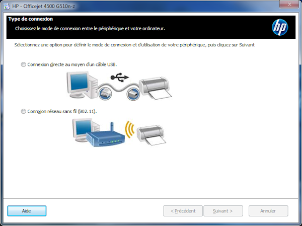 Toujours tenus par la main, en fin d'installation on doit choisir entre la connexion USB ou Wireless. Oui, ce n'est plus vraiment une grosse révolution mais l'imprimante peut être partagée via un réseau sans fil. Pas de connexion Ethernet, juste du Wireless, mais c'est mieux que pas de partage du tout.