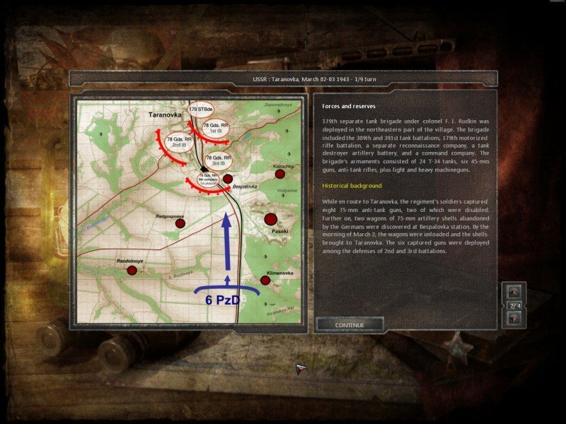 Achtung Panzer : Kharkov 1943 est un jeu de stratégie prenant place durant l'année 1943 donc, plus exactement lors de l'opération Kharkov opposant les troupes Soviétiques aux Nazis. Après un tutoriel assez mal fichu, vous allez pouvoir choisir les destinées des deux forces en présence avant de développer vos compétences afin de se rendre de plus en plus influent. La première chose que l'on constate, c'est que Achtung Panzer : Kharkov 1943 se montre très facile et bien rustre. Pas la peine de vraiment établir de grands schémas tactiques, ou de partir dans des choses compliquées, le titre vous prend par la main, et ne s'embarasse pas de respecter la réalité historique, ni de proposer une gestion poussée des ressources.