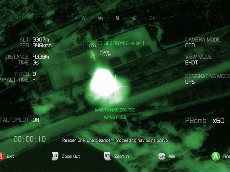 En pressant les gâchettes, la caméra se focalisera sur l'ennemi ciblé, et vous pourrez alors réaliser des mouvements insoupçonnés. S'il n'apparaît pas évident au début de s'y retrouver dans les commandes, cette vue éloignée permettra d'éviter plus facilement les missiles lorsque la zone sera infestée d'avions ennemis. Il en ressort un petit côté cinématique agréable, en tout cas plus que le scénario étrangement bien creux pour un Tom Clancy. Petit ajout sympathique, vous serez désormais chargé de décoller et de faire atterrir votre avion de chasse. Un moment qui peut vite partir en vrille si vous ne suivez pas les instructions.