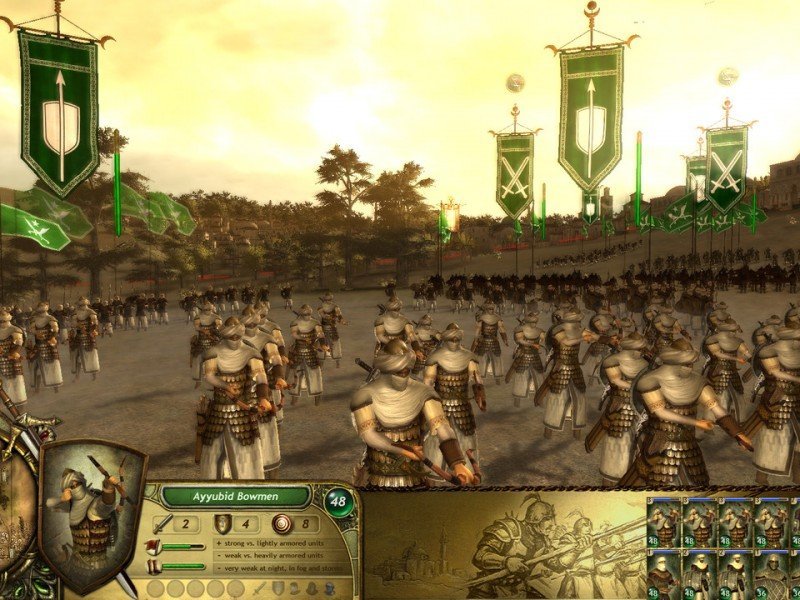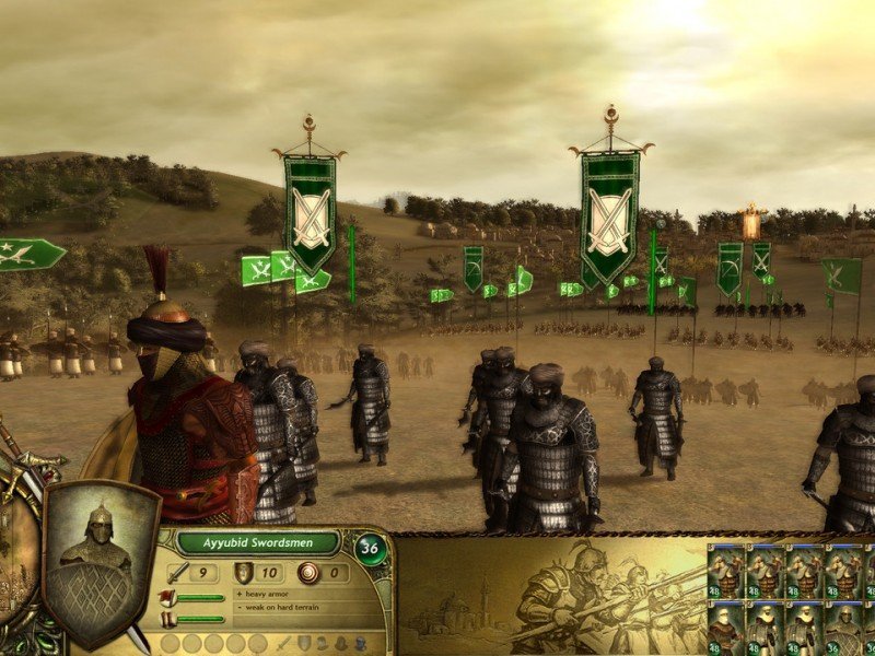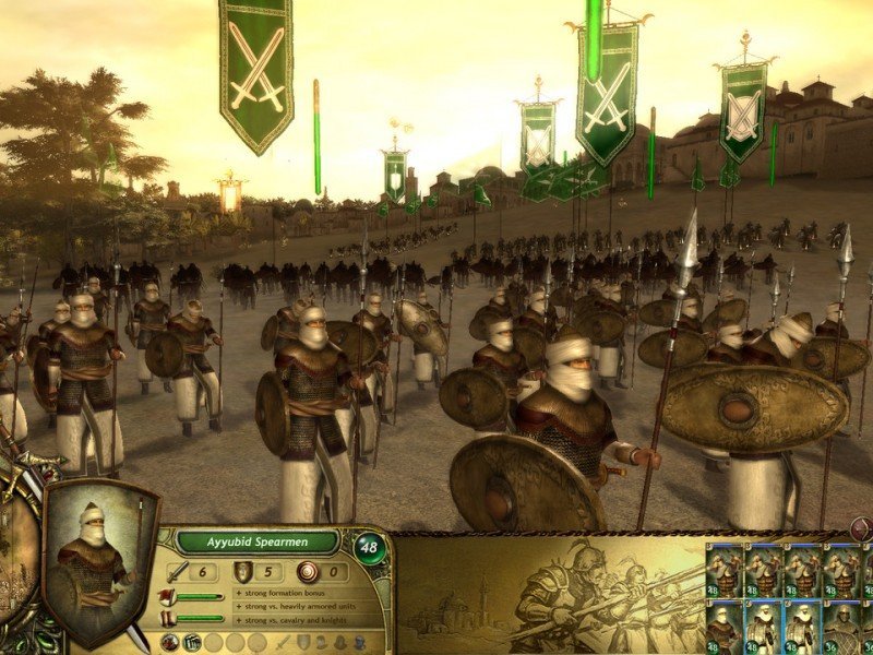 Quatre factions sont proposées parmi les Croisés. La Papauté, le Saint Empire Romain Germanique, l'Ordre des Templiers, et la Couronne de France. Forcément, vos relations évolueront singulièrement durant la partie, et certains objectifs secondaires varieront selon vos affinités. Si vous choisissez les Sarrasins, le gameplay sera également quelque peu différent et les points de culture glanés durant les affrontements permettront d'acquérir de nouvelles technologies.