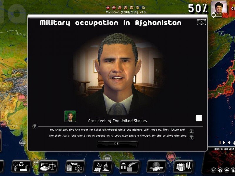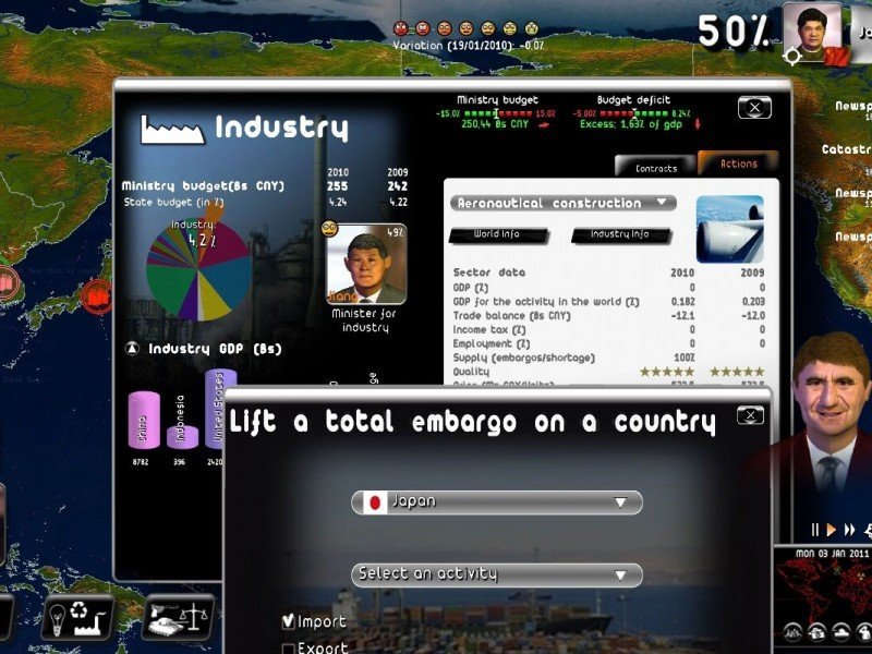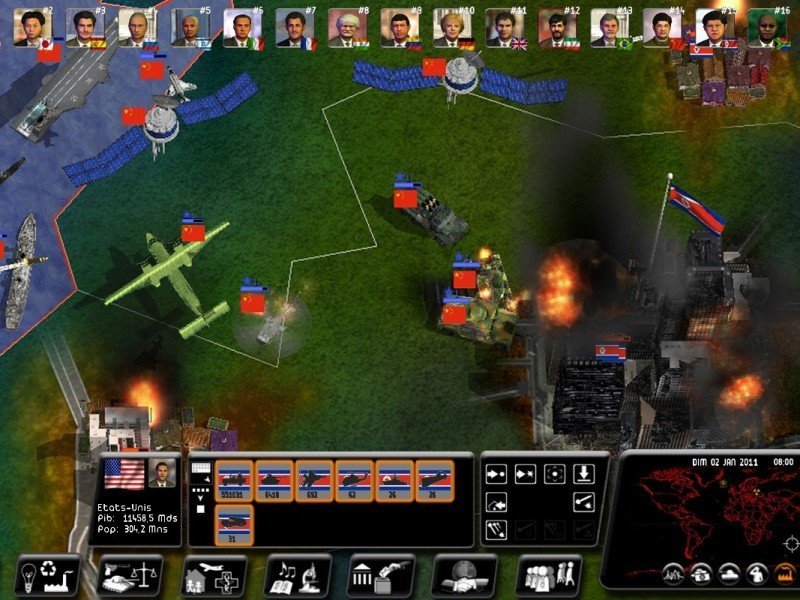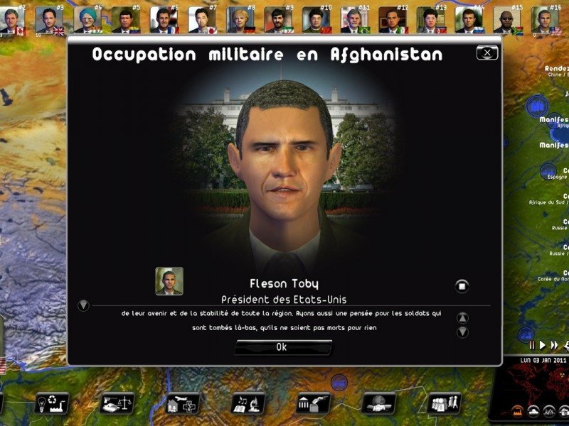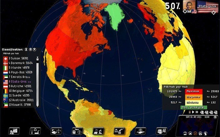 Rulers of Nations : GeoPolitical Simulator 2 nous propose d'incarner un grand de ce monde, et de vous glissez dans la peau du président américain, chinois, russe, français ou autres et tentez de renforcer votre pouvoir dans votre pays et votre influence sur le monde. Vous venez d'être élu chef d'état, et devrez donc faire survivre votre pays dans un monde difficile et il sera vital d'éviter le moindre incident. Vous pourrez cependant déclarer la guerre si vous le souhaitez, même si votre armée est ridicule par rapport à d'autres puissances. Il se créera alors des alliances de fortune, ce qui ne manquera pas de déclencher un bourbier mondial. Dans le mode Compétition, vous serez d'ailleurs en confrontation directe avec quinze autre participants, qu'il soit pris en main par l'ordinateur ou bien par d'autre joueurs. En Simulation, le titre prend tout de suite une autre tournure, et il s'agit ici de découvrir des parties scénarisées. Chaque état possède 11 ministères utiles pour arriver à gérer ses concitoyens, et chaque projet devra être au préalable voté au Parlement, même si on trouvera encore quelques moyens pour passer outre.