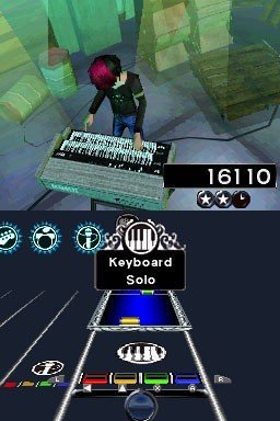 Rock Band 3 change radicalement d'approche par rapport aux autres éditions consoles. Pas besoin de brancher une guitare sur la Nintendo DS, le contrôle est ce qu'il y a de plus classique. Les notes rouges s'effectuent en pressant la touche gauche du pavé directionnel, les jaunes avant la touche haut, le bouton X permettra quant à lui de lancer le vert, et la touche A la note bleue. Rien de plus facile. Et comme dans tout jeu de rythme qui se respecte, il faut presser la touche au bon moment pour enchainer les combos. Cette édition DS comporte quatre pistes en permanence à l'écran, représentant la guitare, la batterie, la voix, ou encore le clavier. Chaque partie se joue indépendamment l'une de l'autre (en pressant L et R, on change de piste) et chaque section réussie permet à l'instrument en question de jouer seul pendant plusieurs mesures, ce qui permet de jouer pendant ce temps une autre séquence musical. Un concept qui n'est pas nouveau et qui rappelle un ancien jeu d'Harmonix sur PS2, le bien nommé Amplitude. Rock Band oblige, on retrouve des musiques très variés (26 thèmes en tout). Quant à la carrière, le mode solo reprend celui vu sur consoles de salon, et la réalisation est également de bonne facture, avec un graphisme clair et dynamique, une bande son sans faille, et un challenge évident.