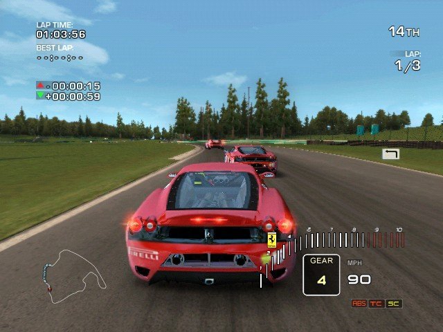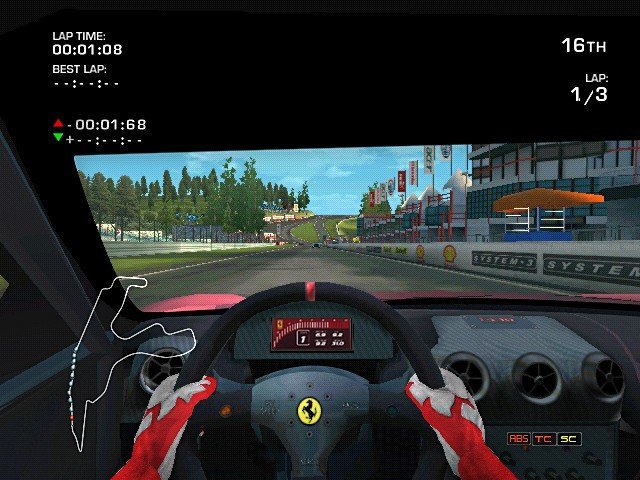 Développé par Eutechnyx, Ferrari The Race Experience comprend trente quatre voitures de la marque au chevron modélisées avec soin (quelques intérieurs font néanmoins un peu trop plastique). Le jeu embarque six vues (trois externes, une ras de sol, une interne et une sur le capot) et quinze adversaires en piste. Si on ressent véritablement le poids de la voiture, on s'aperçoit vite qu'il suffit de savoir doser ses freinages pour éviter le gravier. Vous pouvez court-cuiter allègrement les chicanes, on ne vous dira rien. Naturellement, les puristes pourront désactiver les aides au pilotage, et là le jeu prendra toute autre allure. Les voitures ayant tendance à sur-virer (l'arrière de la voiture part plus vite que l'avant), il faudra se montrer prudent pour ne pas manger les graviers. L'intelligence artificielle s'avère assez réactive et fréquemment, elle n'hésitera pas à vous bloquer le passage si vous essayez de doubler. Comment voulez-vous imaginer une Ferrari endommagée par les collisions ? Ce n'est pas possible, et pourtant, les développeurs l'ont fait même si le résultat est bien timide au final. Vous aurez beau essayer de foncer dans le mur à 240 à l'heure, tout juste écornerez-vous la peinture