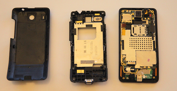 Pour commencer le démontage, on retire la coque arrière. Facile il suffit de déclipser à la main. Pour la deuxième partie cela se complique déjà un tout petit peu car il vous faudra déclipser les petites dents à l'aide d'un fin tournevis. On se retrouve alors avec la coque arrière, suivi d'une deuxième couche de protection et finalement à droite le GSM encore quasi au complet.