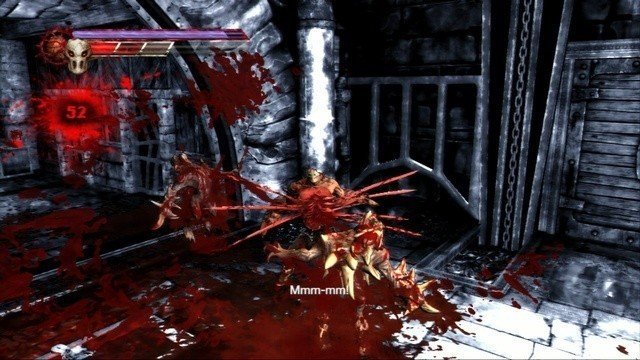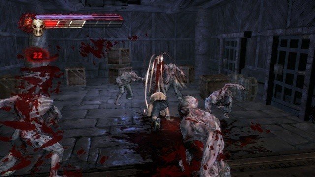 Sur consoles 16 bits, Splatterhouse était un jeu d'action relativement sanguinolent. Forcément, le visuel des supports de l'époque donnait plutôt un côté kitsch qu'un aspect réaliste. Après un développement pour le moins compliqué (le studio BottleRocket a travaillé dessus pendant trois ans avant que Namco Bandai récupère le projet en interne), Splatterhouse effectue un délicat retour sur consoles. Le scénario est assez mince. Alors qu'il visitait un manoir, Rick est mortellement blessé, et sa petite amie Jennifer est enlevée par un savant fou. N'ayant plus rien à perdre, Rick est séduit par la proposition d'un masque démoniaque qu'il décide de placer sur son visage. A l'instar d'un The Mask, le physique et l'apparence de Rick sont brutalement modifiés. Désormais transformé en véritable machine de guerre, il part donc à la poursuite de Jennifer, l'occasion de réaliser un terrible massacre tant les ennemis qui se dresseront sur sa route seront nombreux. Si l'aspect violent ne suffit pas à convaincre, les développeurs ont également pensé à laissé trainer ça et là dans l'aventure, des photos sexy de Jennifer. Sur le plan du concept, Splatterhouse rappelle beaucoup les beat'em all des années 1990. Lorsque vous entrez dans une salle, il n'est plus possible d'en sortir tant que vous n'avez pas fait le ménage (ou peint les murs en rouge). Inutile d'y chercher la moindre dose de finesse, on fonce dans le tas, on frappe sans réfléchir. Voilà voilà. Ah si, certaines séquences en 2D sont également de la partie, mais les contrôles sont tellement aléatoires qu'on pestera plus d'une fois devant son écran, surtout que les points de contrôles sont assez mal placés. Et l'optimisation des données est d'ailleurs sacrément mal fichu, les chargements se déclenchant même parfois en plein combat !