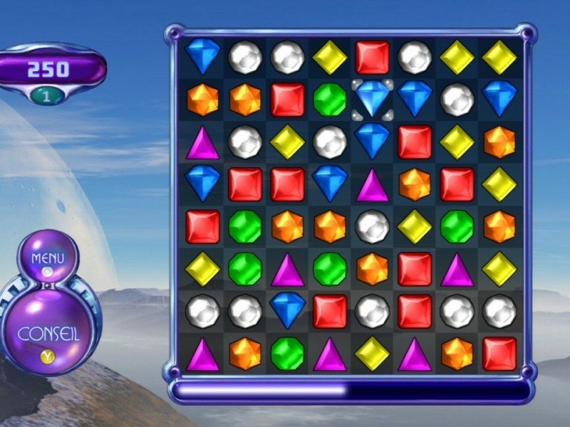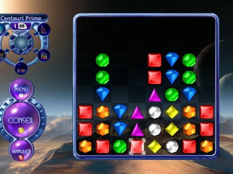 PopCap Hits ! comprend Bejeweled 2, Peggle, Feeding Frenzy et AstroPop. Des jeux disponibles depuis un bout de temps sur Xbox Live Arcade, certains ayant d'ailleurs connu des suites depuis. Bref, le concept de Bejeweled 2 est d'éliminer des blocs présents à l'écran, en alignant verticalement ou horizontalement trois blocs minimum, de même couleur ou de même motif. Concrètement, il vous faudra pousser un bloc pour arriver au bon motif, ce qui n'est pas toujours facile à faire. En effet, certaines fois vous n'aurez pas plus de deux-trois manoeuvres possibles pour vous débarasser de l'intégralité des blocs. D'autres, le temps jouera contre vous, et les blocs montreront jusqu'à envahir totalement la zone de jeu si vous ne réagissez pas dans les temps. Sans compter que comme dans Dr Mario, vous serez parfois embêté par l'ordinateur. Les développeurs ont néanmoins adjoints quelques items bonus à utiliser avec parcimonie, et qui pourront décanter une situation délicate.