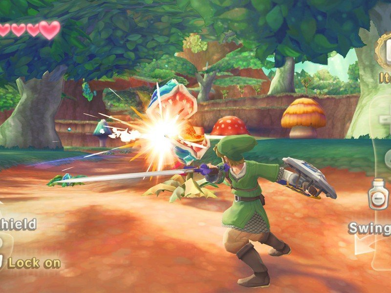 Link pourra désormais utiliser un fouet sur les ennemis et les objets. Le fouet peut également être utilisé pour attraper des éléments et il s’avèrera indispensable dans la résolution de certains puzzles. A noter que les objets que transportent Link peuvent être sélectionnés en temps réel sans nécessiter de mettre le jeu en pause, cela permet de passer d’un objet à un autre de façon plus simple. Dans Skyward Sword, tout comme dans les précédents épisodes de la saga Zelda, la musique joue un rôle majeur et est intégrée dans le système de jeu. Fréquemment, il vous faudra donc interpréter des airs sur la Harpe que Link reçoit au début du jeu.
