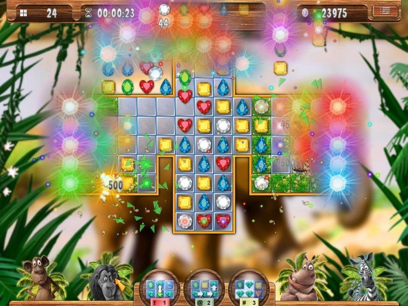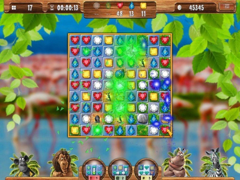 Dans Safari Quest, vous incarnez Jane, une jeune aventurière partie à la recherche du lion blanc en plein milieu de la savane africaine. Il ne s'agit nullement d'un jeu d'aventure cela étant, mais plutôt un titre de "match 3", développé par Cerasus Media (Cradle of Rome, Egypt et consorts). Le concept est donc pour le moins évident, il vous faudra éliminer des blocs présents à l'écran, en alignant verticalement ou horizontalement trois blocs minimum, de même couleur ou de même motif. Concrètement, il vous faudra pousser un bloc pour arriver au bon motif, ce qui n'est pas toujours facile à faire. En effet, certaines fois, des blocs seront verrouillés et ne seront pas déplaçables. Sans compter que le temps jouera contre vous, un sablier étant présent à l'écran. Les développeurs ont néanmoins adjoint de l'aide, avec les animaux Chippy le singe, Leo le lion, Heppo l'hippopotame, et Stripy le zèbre, qui pourront décanter une situation délicate.