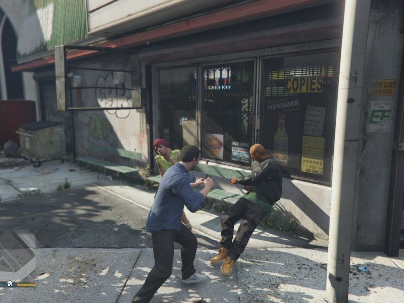 Grand Theft Auto V prend place dans la ville de Los Santos dans l'état de San Andreas, que nous avions déjà en partie visitée dans GTA San Andreas (PS2/PC/Xbox) en 2004. Cette représentation imagée de Los Angeles connaît une période doute économique, frappée par la crise financière mondiale. Contrairement à ses prédécesseurs, GTA V nous permet de suivre l'histoire de trois personnages, criminels cela va de soi. Le premier d'entre eux se prénomme Michael, un ancien braqueur de banques, la quarantaine avancée, dont la vie personnelle est pour le moins compliquée. Il semble vouloir échapper à un lourd passé, et à peine arrive t-il en ville, qu'un certain Franklin tente de lui voler sa voiture ... pour le compte de son patron, un obscur concessionnaire automobile. Ce dernier n'est pas un mauvais bougre en soi, mais ce jeune homme a été victime d'un très mauvais entourage dans sa jeunesse. Au contact de Michael, il va pouvoir prendre un nouveau départ, vers quelque chose mieux calibré ahem. Quant à Trevor, cet individu pour le moins psychotique et ex-pilote dans l'armée, est un ancien "collègue" de Michael qui ignore qu'il est toujours vivant. Il s'est aujourd'hui reconverti dans le trafic de drogue. Les histoires des trois personnages se croiseront à multiples reprises, et chaque héros disposera d'ailleurs de quelques compétences spéciales (Trevor est meilleur au maniement d'armes, Michael peut ralentir le temps pendant une fusillade, Franklin est un as du volant), et même de caractéristiques qui pourront évoluer durant l'aventure, à savoir l'endurance, la furtivité, le vol, la natation, la force ou encore le tir (les activités annexes ne manquent pas). Il est d'ailleurs possible de passer d'un avatar à l'autre par une simple pression sur la croix directionnelle. Lors d'une mission (on en retrouve soixante dix en tout), le switch est souvent automatique, la progression demeurant assez scriptée pour ne pas trop perturber les joueurs. GTA V introduit également des quêtes qui requièrent une préparation, c'est notamment le cas pour effectuer un braquage par exemple. Notez que la visée automatique rappelle Max Payne 3, et cela rend les affrontements plus efficaces (notamment lorsque vous faites face à une vingtaine de policiers)