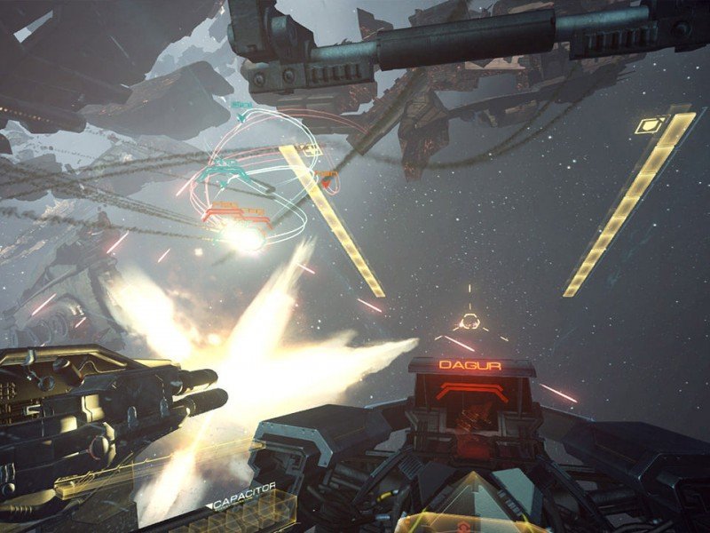 En ce qui concerne la technique, EVE: Valkyrie est assez impressionnant. Quand on est assis dans le cockpit, on a l'impression d'être dans un vrai vaisseau spatial. Il y a des images holographiques montrant différents statuts et, lorsque vous regardez autour de vous, vous vous sentez très mécanique et industriel. Regardez en bas et vous avez les commandes du navire en main. La majorité des armes utilisent le suivi de la tête et lorsque vous vous préparez au lancement, regarder autour de vous déplace les armes dans la direction que vous regardez. Le suivi de la tête est également utilisé pour sélectionner des éléments de menu. Le jeu a même fière allure lorsque vous êtes tué. La couleur est réduite à néant et tout devient bleu, tandis que l'intérieur de votre bateau est recouvert de glace après une brèche dans le cockpit. La séquence de lancement est également excellente lorsque vous empruntez un tunnel dans le vide. Dans les écrans de chargement des matches, vous pouvez regarder autour de vous et voir d’autres pilotes assis dans des nacelles attendant d’être conduits à leurs navires. En jouant, vous gagnerez de l'argent qui vous permettra d'acheter des améliorations, des skins et des implants. Certaines mises à niveau nécessitent de l'argent et de l'expérience pour pouvoir être déverrouillées, et même tôt vous pouvez vous rendre compte qu'il y aura beaucoup de meulage pour vraiment augmenter les attributs du navire. Les implants permettent des bonus pour un temps limité en fonction de vos dépenses et peuvent s'avérer coûteux. Il y a aussi la monnaie en or qui peut être achetée avec de l'argent réel, ou vous pouvez échanger de l'argent pour de l'or.