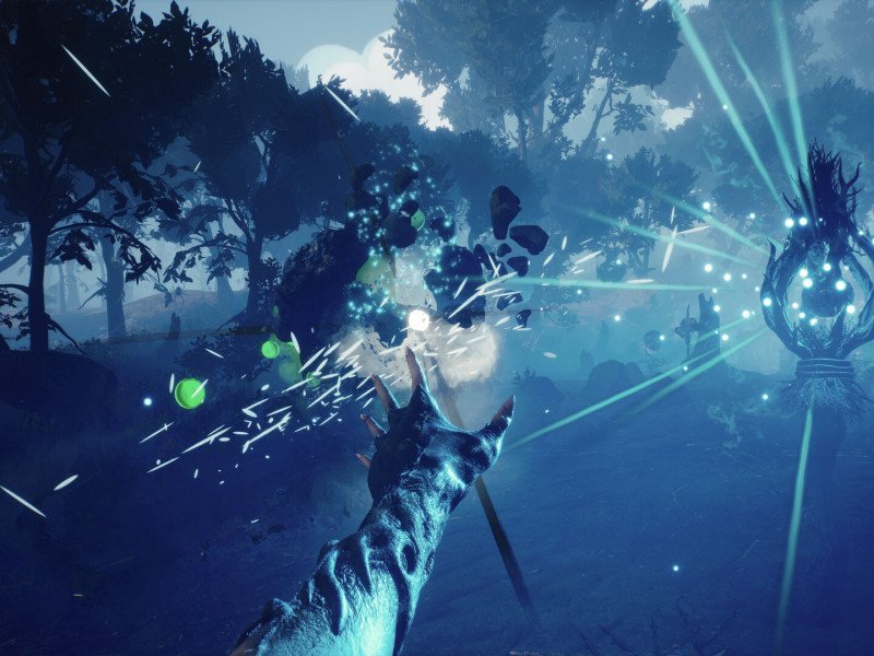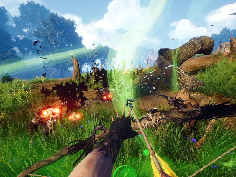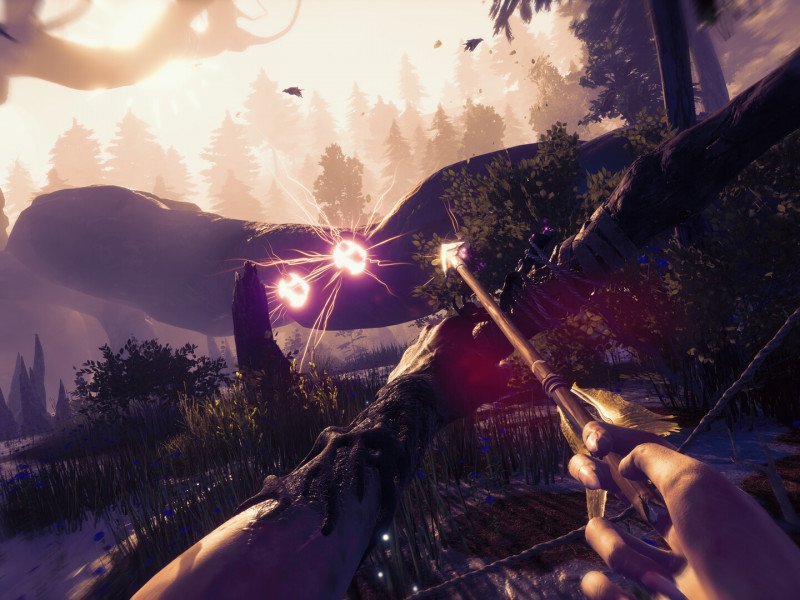 Après avoir passé l'introduction courte et déficiente, les joueurs se retrouvent catapultés dans ce qui fait office de long tutoriel. Blacktail fait immédiatement penser, par son style et ses mécanismes, à l'excellent Horizon : Forbidden West. Yaga est en fait armée d'un arc, pour lequel elle peut forger des flèches en collectant des composants et en les combinant à partir d'un menu radial. Il est également essentiel de chasser pour se nourrir et de faire face aux gnolls, aux feux de fées et à bien d'autres menaces. En bonne sorcière, Yaga peut également invoquer un balai qui servira d'appât pour les ennemis, qui deviendront des proies faciles pour nos attaques. En progressant dans le jeu, vous débloquerez également de nouveaux outils, tels que des antidotes et des flèches de différents types. Ces outils deviennent très importants pour survivre dans un monde ouvert plein de dangers, avec des araignées prêtes à nous infecter et des ennemis qui n'hésiteront pas à nous chasser à mort. Ou du moins, ils essaieront : Yaga est en fait fondamentalement immortelle et, en cas de disparition prématurée, elle s'élèvera sur des autels spéciaux où nous devrons laisser des fleurs en guise d'oboles. Il est toutefois important de les visiter souvent, sous peine de perdre tous les progrès réalisés. Contrairement à l'œuvre précitée de Guerrilla Games, Blacktail se déroule entièrement à la première personne. La seule chose que les joueurs peuvent voir sont les mains de Yaga, laissant l'accent sur le décor. Les gars de The Parasight ont en fait créé un monde sauvage qui s'inspire des légendes slaves. Attendez-vous donc à beaucoup de citations, de sculptures de dieux orientaux et à beaucoup de bizarrerie. On regrette un certain manque de profondeur, dû à un brouillard omniprésent, qui n'enlève rien à la magie du monde créé par l'équipe. Malgré des allusions aux contes de fées, qui rappellent à certains égards Alice au pays des merveilles, les thèmes abordés sont plutôt matures et conduisent presque à des moments d'horreur. Les palettes de couleurs plutôt vives sont parfois surprenantes : le monde est vert et luxuriant, parsemé en outre de personnages étranges tels que des champignons et des insectes avec lesquels on peut sympathiser. Rien de vraiment inédit cependant, même si le mélange s'avère agréable et tout à fait adapté au thème.