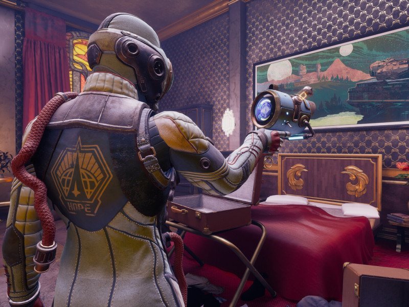 Après Peril on Gorgon, le développeur Obsidian Entertainment propose maintenant la deuxième et dernière extension pour The Outer Worlds, intitulée Murder on Eridanos. En son sein, on nous demande d'enquêter sur le meurtre de l'actrice Ruth Bellamy, plus connue sous le nom d'Halcyon Helen dans "Terror on Monarch". Helen était également l'égérie de Rizzo et était sur Eridanos pour dévoiler un nouveau produit. Une fois que nous avons atterri sur le complexe atmosphérique d'Eridanos, l'endroit où se déroule cette extension, nous sommes immédiatement conduits dans la salle de bal de l'hôtel Grand Colonial et sur la scène du crime. Là, nous recevons l'amplificateur de discordance du coroner. Cet appareil à demi intelligent a une personnalité plutôt spirituelle, mais il peut nous aider à résoudre l'affaire du meurtre. En scannant des objets et autres, des traces et des indices deviennent visibles. Par exemple, sur la scène du crime, nous voyons une empreinte de pas qui appartient à Helen et la lettre "B" est écrite sur le sol. A-t-elle essayé d'écrire le nom de son tueur ici, ou le tueur essaie-t-il de nous égarer ? S'ensuit l'interrogatoire des différents suspects et la recherche d'indices dans les différents lieux. Comme dans le jeu de base et dans Peril on Gorgon, Murder on Eridanos présente un casting de personnages intrigants. Parmi eux, le collègue acteur d'Helen qui a toujours été jaloux d'elle, le joueur de football et amant d'Helen et le patron de SubLight Underground qui n'a manifestement aucun problème à tuer des gens. L'humour cynique rend encore une fois amusant le fait de parler aux différents personnages. Dans votre chambre d'hôtel, vous pouvez tranquillement examiner l'affaire de meurtre et obtenir des informations sur les différents suspects, les victimes (oui, il n'y a pas qu'Helen qui est tuée par le tueur) et les preuves que vous parvenez à trouver.