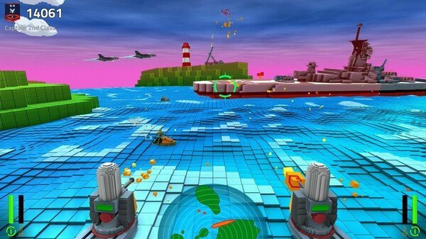 Battle Stations Blockade part d'un principe simple : proposer un jeu de tir sur rails très classique, représenté en voxels, et se déroulant sur un navire en mouvement constant. On parle donc d'un genre typiquement arcade, très difficile à proposer de manière intéressante. Battle Stations Blockade ne propose pas une histoire digne de ce nom, mais se limite à une contextualisation narrative : vous êtes aux commandes d'un navire de guerre naviguant dans des eaux hostiles, et il est de votre devoir d'en sortir indemne. Tout cela est principalement souligné par une première cinématique initiale, qui sert également d'introduction aux mécaniques de jeu. Dès lors, toute contextualisation narrative passe au second plan et on assiste à une succession de niveaux. Voici donc un premier défaut : le titre reste bien trop générique et ne propose rien qui puisse être d'une manière ou d'une autre intéressant sur le plan narratif. Cependant, le gameplay est le point fort de Battle Stations Blockade. Le titre présente une boucle très classique , qui voit une alternance continue de niveaux caractérisée par un parcours prédéfini. Autrement dit, vous partez du point A et regardez le navire arriver au point B, sans possibilité de s'écarter de ces traces invisibles. Ce chemin est cependant continuellement interrompu par des ennemis qui apparaissent devant le navire lui-même. Et là, nous trouvons un problème. La trajectoire suivie par le navire est toujours dénuée de mordant : il y a l'absence quasi totale d'abris, de situations particulières ou en général de tout ce qui pourrait briser la sensation d'être littéralement sur les rails. Dans chaque niveau, les ennemis se tiennent simplement devant vous, agissant comme des cibles mobiles et tirant. Pour notre part, cependant, nous avons la possibilité d'encaisser pratiquement tous les coups reçus, compte tenu de la santé très élevée du navire et de la possibilité de recharger les points de santé simplement en détruisant tout. Tout ce dont vous avez besoin c'est d'un bon objectif et c'est fait.