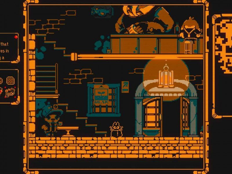 Développé par Nautilus Games, Everdeep Aurora est un jeu de plateforme et d'aventure en 2D, à l'exploration verticale et axé sur l'excavation, similaire à Spelunky et SteamWorld Dig. Le tout est présenté avec des graphismes minimalistes, presque monochromes, rappelant les jeux Game Boy et Undertale. En effet, le jeu parvient à transmettre beaucoup de choses avec seulement quelques pixels, créant un conte de fées sombre qui captive et captive, nous entraînant dans les profondeurs de la terre à la recherche de secrets et de personnalités difficiles à imaginer, mais passionnants à explorer et à découvrir. Dans l'ordre, une terrible pluie de météores a littéralement provoqué l'apocalypse, forçant les populations survivantes à se réfugier dans des labyrinthes souterrains qui, inutile de le préciser, sont devenus leurs véritables foyers. Dans ce monde désolé, nous incarnons le doux rôle de Shell , un jeune chaton qui se réveille avec pour seul message sa mère. Notre chère mère nous demande de la rejoindre dans les profondeurs, et nous ne pouvons donc que partir immédiatement. Complètement dénués de tout équipement, nous ferons nos premiers pas à la surface, où nous rencontrerons le premier des nombreux personnages étranges qui peuplent Everdeep Aurora : une grenouille voyageuse. L'amphibien semble lui aussi déterminé à s'enfoncer dans les profondeurs, et nous la croiserons d'ailleurs souvent lors de notre descente. De plus, il nous servira de mentor et de « sauveteur ». La grenouille, en effet, nous donne les bases pour commencer notre expédition souterraine et, de plus, propose de nous « prendre en charge » dès que nous en aurons besoin.