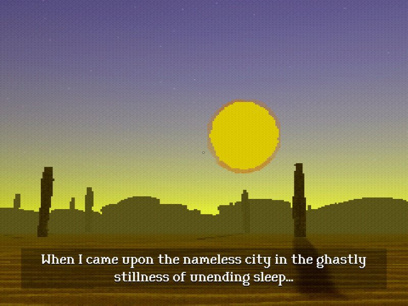 « The Nameless City » a été écrit en janvier 1921 et publié pour la première fois dans le numéro de novembre 1921 de The Wolverine, une revue de presse amateur. « La Cité sans nom » se déroule quelque part dans les déserts du Moyen-Orient. Les passionnés de Lovecraft ont évoqué le Yémen, mais l'ambiance archéologique du récit évoque davantage l'Égypte. Le narrateur anonyme parcourt le désert à la recherche d'un lieu si ancien que son nom est oublié et qu'il n'apparaît même pas dans les mythes. Bien que le jeu soit basé sur la nouvelle de Lovecraft, aucune connaissance préalable du monde n'est requise. Vous incarnez simplement un aventurier anonyme cherchant à localiser une cité oubliée au milieu d'un désert. L'histoire est racontée par la voix du narrateur, qui commente ce qui lui arrive et fait des observations, sans grande surprise. Il s'agit avant tout de présenter une expérience. Le tout est accompagné d'images imitant un style d'il y a quelques générations. L'aspect peut paraître granuleux et complexe, mais il convient parfaitement à l'environnement étrange et étranger que vous explorez. Le jeu est linéaire, vous offrant peu d'options. Outre les mouvements de base, vous pouvez vous accroupir pour ramper dans de petits espaces, interagir avec les objets de l'environnement et allumer votre torche. Pas d'inquiétude : la torche éclairera en permanence, sauf si l'histoire vous la retire. L'interaction avec le monde se limite à l'observation des objets, qui sont signalés par une icône en forme d'œil lorsque vous passez la souris dessus. Certaines images et objets étranges peuvent vous donner des frissons, mais ils ne sont pas mortels en soi. Cela n'exclut pas la possibilité de mourir. Si vous tombez trop souvent dans des trous ou du haut de falaises, vous perdrez toute votre « colonne vertébrale ». Heureusement, de nombreux points de contrôle vous permettent de conserver votre progression. Vous devrez également résoudre quelques énigmes simples. Au cours de votre exploration, vous rencontrerez plusieurs glyphes issus d'une langue ancienne. Ils sont notés dans votre carnet et utilisés pour ériger ou supprimer une barrière. Si la suppression est sans danger, lancer des sorts peut nuire à votre santé. C'est très facile.