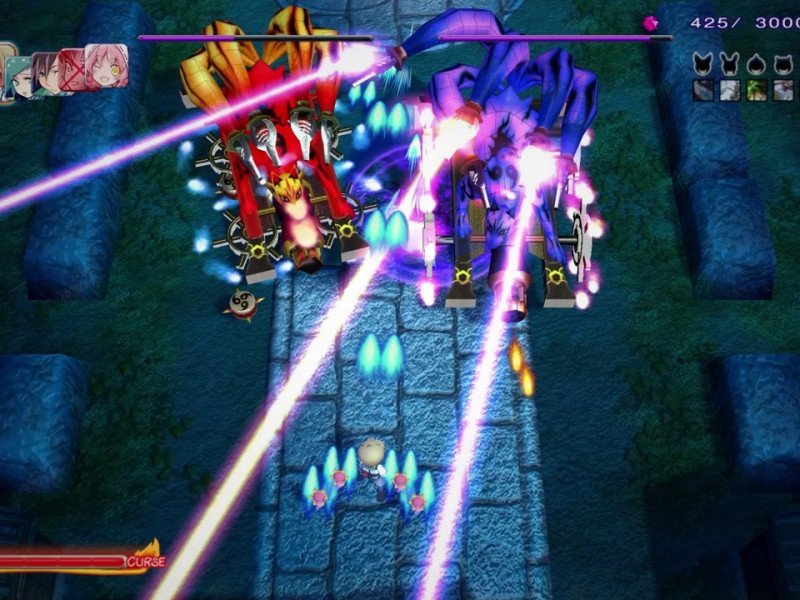 Dans Mamorukun ReCurse!, l'écran ne se déplace pas automatiquement , mais suit les mouvements que vous assignez à votre personnage. Attention cependant : si l'écran « se lève », vous ne pourrez plus revenir en arrière. Quant aux autres capacités, le système de jeu évolue au gré des changements de règles, permettant d'utiliser un personnage unique ou une équipe créée spécialement pour le jeu, incluant des personnages DLC issus de différentes éditions postérieures à 2008. La durée de vie et la difficulté sont intimement liées et dépendent fortement de l'expérience du joueur. De par sa conception, Mamorukun ReCurse! est assez difficile et gratifiant, même s'il manque d'originalité. Le principe est simple : il faut tirer sur tout ce qui bouge. La véritable exception réside dans les fameuses « balles maudites », qui peuvent être utilisées stratégiquement selon vos objectifs. Plus vous maintenez le bouton de tir enfoncé, plus elles peuvent maudire les ennemis et vous-même, et toucher des zones proches ou éloignées. Mais en quoi consiste cette malédiction ? Si vous êtes maudit, vous gagnerez des bonus de puissance et de vitesse , mais vous ne pourrez pas tirer de projectiles maudits. Une fois la malédiction dissipée, vous subirez un malus. Les ennemis maudits, quant à eux, subissent des dégâts continus et rapportent un bonus de score important en cas de victoire. De plus, les projectiles maudits génèrent une onde de choc bénéfique qui détruit les projectiles ennemis à l'écran, offrant une brève invulnérabilité.