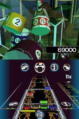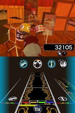 Rock Band 3 change radicalement d'approche par rapport aux autres éditions consoles. Pas besoin de brancher une guitare sur la Nintendo DS, le contrôle est ce qu'il y a de plus classique. Les notes rouges s'effectuent en pressant la touche gauche du pavé directionnel, les jaunes avant la touche haut, le bouton X permettra quant à lui de lancer le vert, et la touche A la note bleue. Rien de plus facile. Et comme dans tout jeu de rythme qui se respecte, il faut presser la touche au bon moment pour enchainer les combos. Cette édition DS comporte quatre pistes en permanence à l'écran, représentant la guitare, la batterie, la voix, ou encore le clavier. Chaque partie se joue indépendamment l'une de l'autre (en pressant L et R, on change de piste) et chaque section réussie permet à l'instrument en question de jouer seul pendant plusieurs mesures, ce qui permet de jouer pendant ce temps une autre séquence musical. Un concept qui n'est pas nouveau et qui rappelle un ancien jeu d'Harmonix sur PS2, le bien nommé Amplitude. Rock Band oblige, on retrouve des musiques très variés (26 thèmes en tout). Quant à la carrière, le mode solo reprend celui vu sur consoles de salon, et la réalisation est également de bonne facture, avec un graphisme clair et dynamique, une bande son sans faille, et un challenge évident.