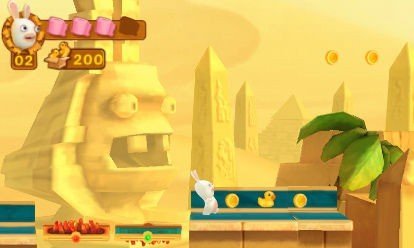 Dans le cinquième volet des Lapins Crétins, Retour vers le passé, le concept reprenait la formule du party game sur Wii. Sur Nintendo 3DS, ce n'est pas du tout le cas puisque nous retrouvons un jeu de plate-forme en vue de profil. Le scénario demeure toutefois similaire : Les Lapins Crétins ont décidé de réécrire l'histoire afin de prendre le contrôle du monde. Pour cela, ils utiliseront une machine à laver (!) un peu spécial, qui permet de rentrer dans les tableaux exposés dans un musée. Une fois sur le terrain donc, on assistera à des épreuves assez classiques d'action. Rien de nouveau sous le soleil apparemment depuis un Mario, et pourtant le jeu s'avère très drôle. Par exemple, pour récupérer de la vie, il faudra mettre la main sur des rouleaux de papier toilette. Ce qui est un peu plus dérangeant, c'est la relative facilité de Rabbids 3D (The Lapins Crétins 3D en VF).