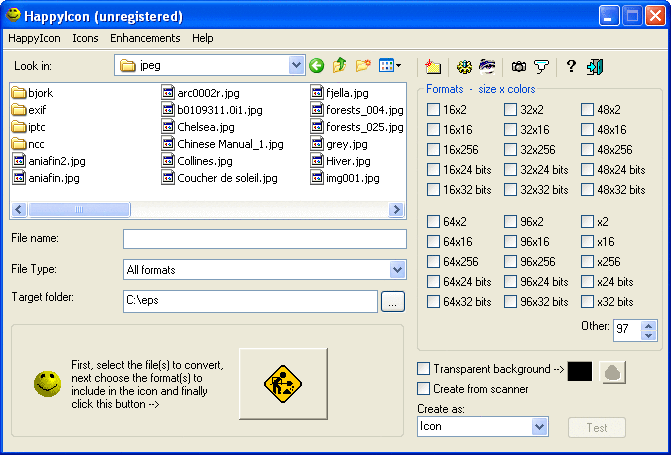 HappyIcon turns large images and photos into perfectly proportioned icon, XP profile iconss and cursors with a minimum of fuss. Just select a graphic in .bmp, .cam, gif, .j6i, .jng, .jpg, .pcd, .pcx, .pic, .png, .psd, sj1, .tga, or .tif format or else scan a photo. Then check off the size(s) and color depth(s) of icon/cursor you wish to create. (That's right, HappyIcon supports multiresource .ico files.) Press a button, and in just moments you'll have a great-looking miniaturized version of your original image. It doesn't get much easier than this!