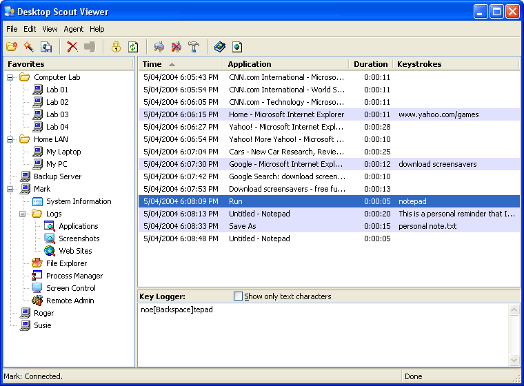 Desktop Scout is a powerful computer surveillance program which can be used in the home, school or office to monitor and record every detail of PC and Internet activity. The program contains several integrated tools which work together to record all programs used, keystrokes typed, web sites visited, files created or changed, and a screenshot logger which can take hundreds of snapshots every hour. The surveillance logs can be viewed in real-time from a remote computer, so you can monitor your kids or employees remotely from the comfort of your own workstation. You can even watch or control the users desktop, transfer files, start and stop programs, launch web sites and documents, log off, restart or shutdown the computer remotely. The program incorporates a high level of security and data privacy measures. Access to the program and logs is restricted by an administrator password, network traffic is encrypted to prevent eavesdropping, and logs are compressed and encrypted before storage. The program runs as a Windows service, which makes it impossible for users without administrator privileges to disarm or uninstall.