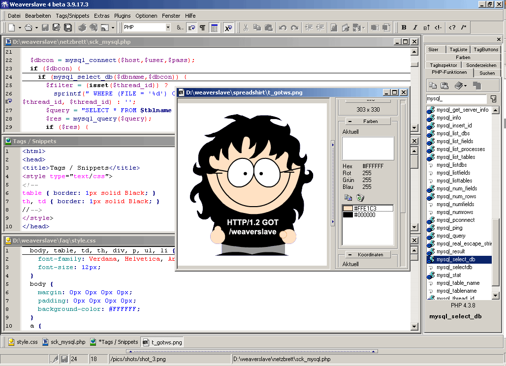 The Weaverslave is a flexible editor. You can insert HTMLtags or other text snippets from menu or a tool window. The text snippets can be change with a dialog. Tool windows for colors, entites and a taginspector are avaliable. File an image browser are integrated, too. The editor has syntax highlighting for DHTML, PHP and SQL. You can add functions with plugins. Integreated preview with ie and gecko. Some function for jpeg manipulation are included, too.