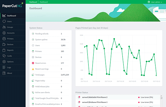 (0 Votes)PaperCut NG is print management software designed to offer features like print quotas, tracking, and control to promote the responsible use of IT resources. It's a premium cross-platform solution specifically designed to meet the needs of schools, universities and other organizations. Implementations range from silent monitoring, quota control to user-pays systems. PaperCut NG leads the way with innovative features, cross-platform support, source code access and enterprise level scalability. A 40-day unrestricted trial version is available for download. Highlights: * Innovative 100% web-based administration allowing admin control from anywhere on the network. * Cross-platform support for both servers and clients. Available for Windows, Mac, Linux, Novell and Unix. * Differential print charging allowing costs to be defined per printer with varied prices for color, duplex and large form printing. * Many print management features including toner level detection and printer error alerts. * TopUp/PrePaid Cards - ideal for student payment management. * Print release stations for secure printing, or for pay-per-print usage in public libraries or internet cafes. * Manage wireless and unauthenticated printing from user-owned devices (Web Print). * Advanced reporting in PDF, HTML and Excel. * Charge printing to shared accounts - great for allocating printing costs to departments, faculties or cost centers. * Import users and groups from Active Directory or an LDAP server like Novell eDirectory or OpenDirectory. * Scalability up to 100,000+ users with the option to take this further with application server clustering. * Option to use external databases such as Microsoft SQL Server, Oracle Database, the free Microsoft SQL Server Express, the free/open source PostgreSQL database engine and the free/open source MySQL database. * Full support for multiple print servers and monitoring of local desktop printers. * Error notifications when printers are in error.