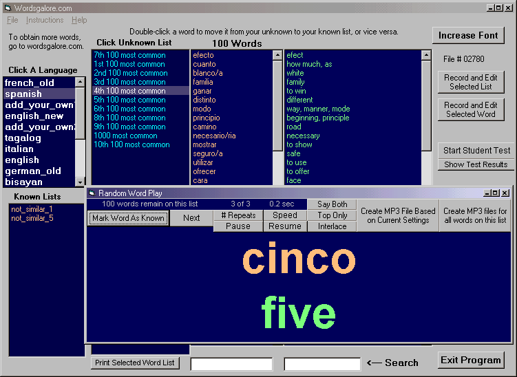 Learn up to 9,100 words using sound and text flash cards and word lists. It remembers which words you've marked as "known" so that they are removed from your rotation list. It can also create MP3 files for your portable MP3 player. Initial download has only the 1,000 most common Spanish words, but all 9,100 words are freely available on the web site.