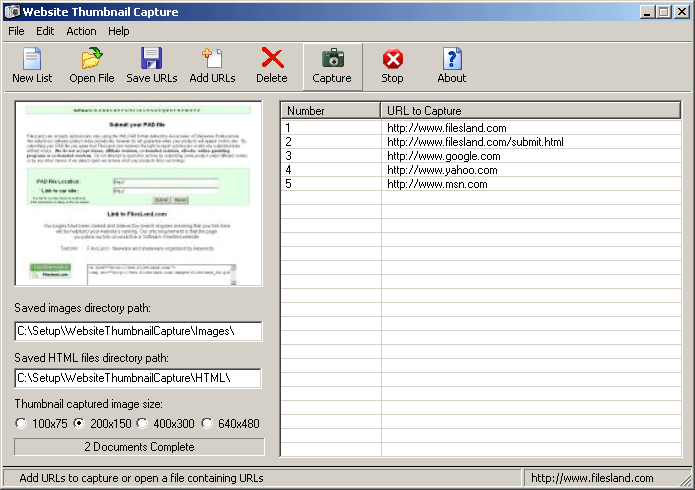 Website Thumbnail Capture tool creates thumbnail screen shots of web pages, downloads underlying HTML code and saves them to your hard drive. The software allows to load and save up to a thousand URLs at once and create galleries of thumbshots. Several web screen shot resolution sizes are supported. Batch processing is available: just load a list of URLs in a plain ASCII format in this program, click once button and a gallery of thumbnail images and HTML files containing page source data is saved on your hard disk.
