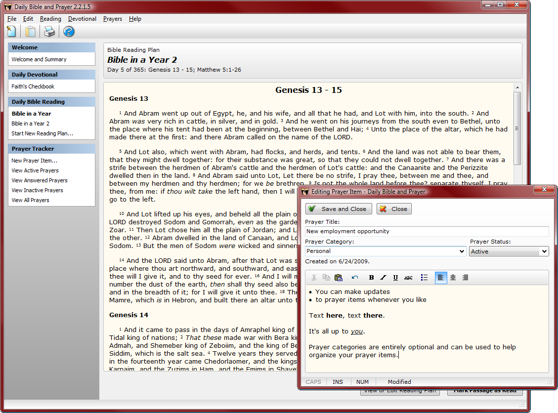 (0 Votes)Daily Bible and Prayer features Bible reading plans, daily devotional, and prayer tracker. The Bible reading plan will get you through the Bible in a year with two different methods, and allows you to create custom reading plans for any amount of Scripture and time. Daily Bible and Prayer will track your progress and help you catch up if you fall behind. You can read the KJV Bible text in the program or simply use it as a planning guide to read from your printed Bible. Also included is the Faith's Checkbook daily devotional by C.H. Spurgeon, with an edifying and uplifting message for each day of the year. Finally, the prayer tracker will help you keep your prayer list organized and move answered prayers into a separate list when the time comes. Combining all three tasks into one program makes this program perfect for helping you with your quiet-times.