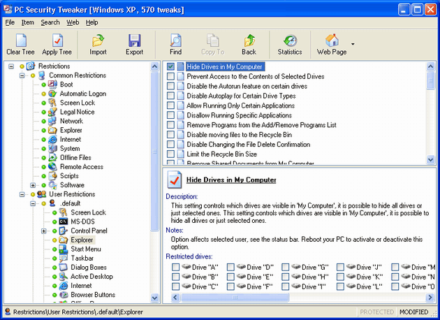 (0 Votes)PC Security Tweaker is a security tweaking utility you can use to tweak Windows-based computers. It is compatible with all Windows versions and lets you control which users are allowed to access your PC and the level of access each user may have. You can choose to tweak access to lots of Control Panel applet functions, including Display, Network, Passwords, Printers, System, Add/Remove Programs, etc. You can enforce users to use separate system profile folders and provide them with their own custom shell folders such as Desktop, Start Menu, Favorites, My Documents. Additionally, by tweaking, you can: disable selected Start Menu items, lock and protect disk drives in My Computer, disable the DOS and command prompt, interruption boot keys, real DOS mode, Registry editing, taskbar, task manager, and network access, hide desktop icons, and much more. You can password-protect Windows and restrict users to running specific applications only. Security tweaks can be applied universally or just to specific users. This software also lets you tweak Internet Explorer to secure web browsing.
