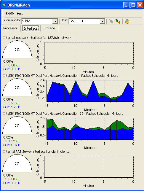 (0 Votes)When it comes to ease of use and functionality BPSNMPMon is an invaluable tool for monitoring network traffic, storage utilization and processor load. BPSNMPMon is a SNMP (Simple Network Management Protocol) utility that will monitor host processor, storage and interface values. BPSNMPMon performs various SNMP queries at a user-defined time interval and graphically represents the information in a simple user friendly interface. The current SNMP query results are displayed in a gauge as a percentage and also in a historical user-definable value graph. For each SNMP community/host BPSNMPMon queries the HOST-RESOURCES-MIB (Management Information Base) (RFC2790) hrProcessorEntry table. For each hrProcessorFrwID OID (Object IDentifier) the corresponding hrProcessorLoad OID value is queried and displayed. The hrStorageEntry table of the HOST-RESOURCES-MIB is also queried for the hrStorageUsed OID value for each hrStorageIndex entry. The hrStorageUsed value is reported percentage of the hrStorageSize and graphed by value. The hrStorageTypes that are displayed are hrStorageRam, hrStorageVirtualMemory, hrStorageFixedDisk and hrStorageRamDisk. From RFC1213-MIB ( RFC1213) BPSNMPMon also sends SNMP queries for each ifIndex OID in the ifEntry table. To determine the host's in and out interface activity load the ifInOctets and ifOutOctets values are utilized. BPSNMPMon is a small but useful utility that is easy to use and best of all BPSNMPMon is available free of charge and runs fine without installing anything! BPSNMPMon doesn't create any new registry-keys, change system settings or create hidden files on your computer. Simply remove the executable, configuration and help file and BPSNMPMon is completely removed from your computer.