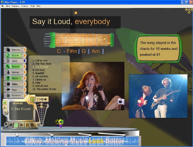 (0 Votes)CDizz is an innovative, free media player that upgrades any music file or CD into a rich multimedia experience. Using music identification, the player displays designated dynamic online content. Lyrics, Images, Flash Animations, Animated chords, Karaoke, Video Clips and more, including user contributions. By getting both official and user-generated content, users actually connects to a social network based on their taste in music. Within this Musical Network you can: Create a personal profile page with a list of your music collection. Upload your own contributions and share them with other people in your network. Receive CDizz Pointzz for every upload. Rate items and more... CDizz Player Key features include: Innovative Media Player with streamlined design. CD recognition MP3 ID3 Tag Support Song Lyrics Animated Karaoke Animated Graphical Chords Images & Slideshows Trivia Pops - Synchronized with song Smart Intro - plays user-selected track samples News, reviews etc. Flash animations, games and applications CD Credits Skin can change for every track Users can publish and share their creations Voting and Rating system A personal profile page including music collection items Mini player mode