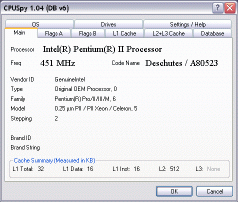 (0 Votes)Most x86 processors support the CPUID instruction which returns data describing the make and model of the CPU. Later processors also support extended features such as cache details, processor features, design speed and processor name. CPUSpy interrogates your processor and displays this data (if supported) in a easy to read tabbed format. L1, L2 and L3 cache data is fully broken down as are the processor flags. In addition, CPUSpy can also check your current CPU speed in MHz, Windows Up-Time, IP address, Window Version and memory status. CPUSpy even can run a test on your cache memory to provide an easy comparison between various processors or system configurations. CPUSpy also has an internal database of many common CPUs, supporting most AMD (tm), Intel (tm) and Transmeta (tm) processors. This can be used to compare between processors features such as bus speed, maximum frequency, cache sizes, release dates, codename, and transistor count. Interesting facts are also included for most major models. A OS database is also included for comparing past current and future versions of Windows as well as information on you computers drives. Processor data can be saved in a HTML report file providing an easy way to extract data from a PC and analyse it later. CPUSpy is written in 100% assembly language.