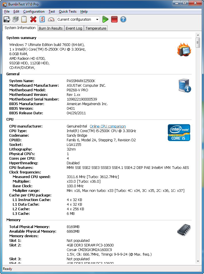 Society's reliance on computers means that the cost of hardware failure can be enormous. BurnInTest can thoroughly exercises PC hardware in the shortest period of time so intermittent or hidden problems are found before they turn into a disaster. BurnInTest is an easy-to-use software tool that simultaneously exercises all of the major components of a computer to test for endurance and reliability. The user can select hardware components to test and individually adjust the load placed on each one via slide bars. Each test reports results to its own window and results are summarised along with any errors detected in the main program window. A computer's major components (including CPUs, raw and formatted hard drives, tape/CD/DVD/Blu-Ray drives, sound and graphics cards, RAM, network connections and ports) can be tested at the same time. Results can be saved to disk, printed or exported as a graphical image. Other features include periodic logging, a temperature monitoring interface and max CPU temperature test, and timed test runs. BurnInTest also gives users access to detailed system information including as the CPU data (such as amount of CPU cores and physical CPUs, CPU features, clock speed and L2 cache size); Physical and Virtual Memory read outs and advanced Graphics Card information. Pre-defined quick tests, context sensitive right-click menus and hotkeys for common tasks means that stress-testing your machine has never been easier. BurnInTest is also available with serial, parallel and USB loopback plugs to facilitate port testing and features comprehensive online help and in-built help files. All purchases of BurnInTest 7 include 12 months of free technical support and major/minor software upgrades. BurnInTest is suited to computer enthusiasts, systems integrators and manufacturers or anyone who wants to cost effectively evaluate their system.