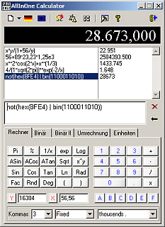 (0 Votes)pmaCalc combines a scientific calculator, binary arithmetik for programmers, and unit converter in an interesting package. In addition to a fair range of scientific functions, it has an unusual numeric stack, and a binary mode that supports decimal, hexadecimal, octal, and binary arithmetic, with a full complement of logical operators and bit manipulation instructions. It has7 lines: hex, oct, dec, bin, ascii, 2's compl. and roman. Each line is clickable for new data input. The others immediately reflect that data input in their respective bases. You can enter expressions by pressing buttons or by typing them in (it's advisable to take care with the syntax), and the stack offers a flexible alternative to the usual memory functions. You can use fixed,floating and sci. point modes. Other features include a Euro converter that handles all European Union currencies, 150+ Units and 500+ Convertions.